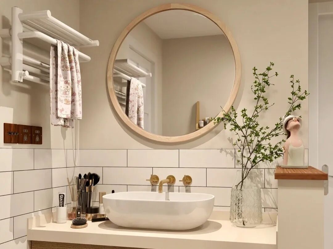 洗手台不需要太大,台面只要能够放下一些洗面奶、洗手液等常规洗漱用品即可,其它的东西尽可能收纳起来,放在浴室柜中。