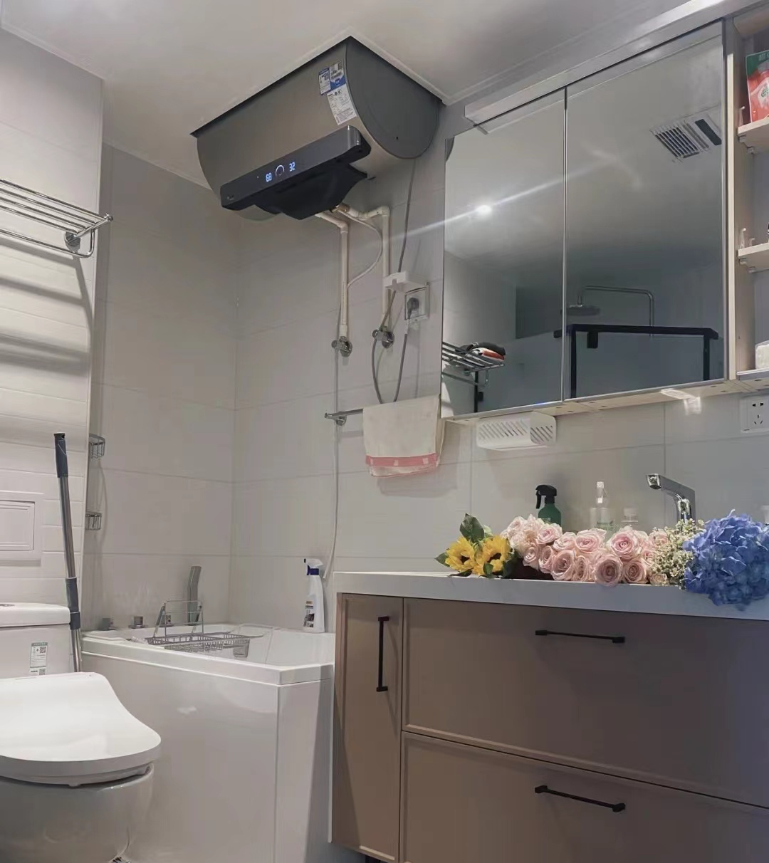 很多家庭卫生间用的是电热水器,但是这么大一个水箱,小户型装它真的是很占空间,比较压头,还存在漏电安全隐患(洗澡最好拔掉插头)。