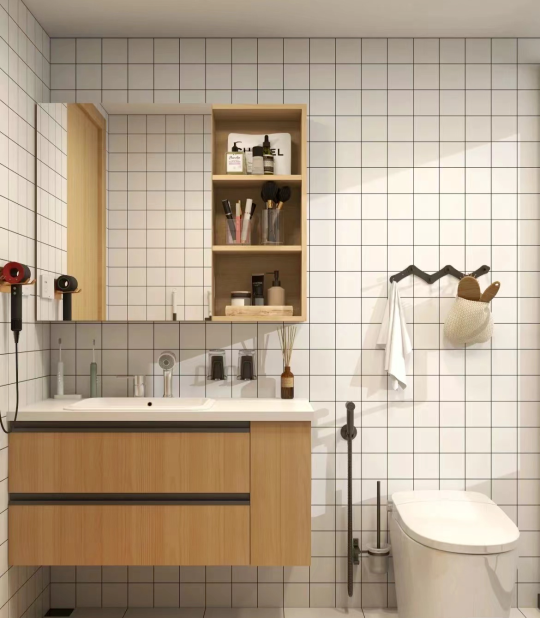 很多家庭的卫生间都是3-4㎡,本身空间就不大,但是承载的任务可不小,如果能将一些东西以大变小,自然就可以省下不少空间。