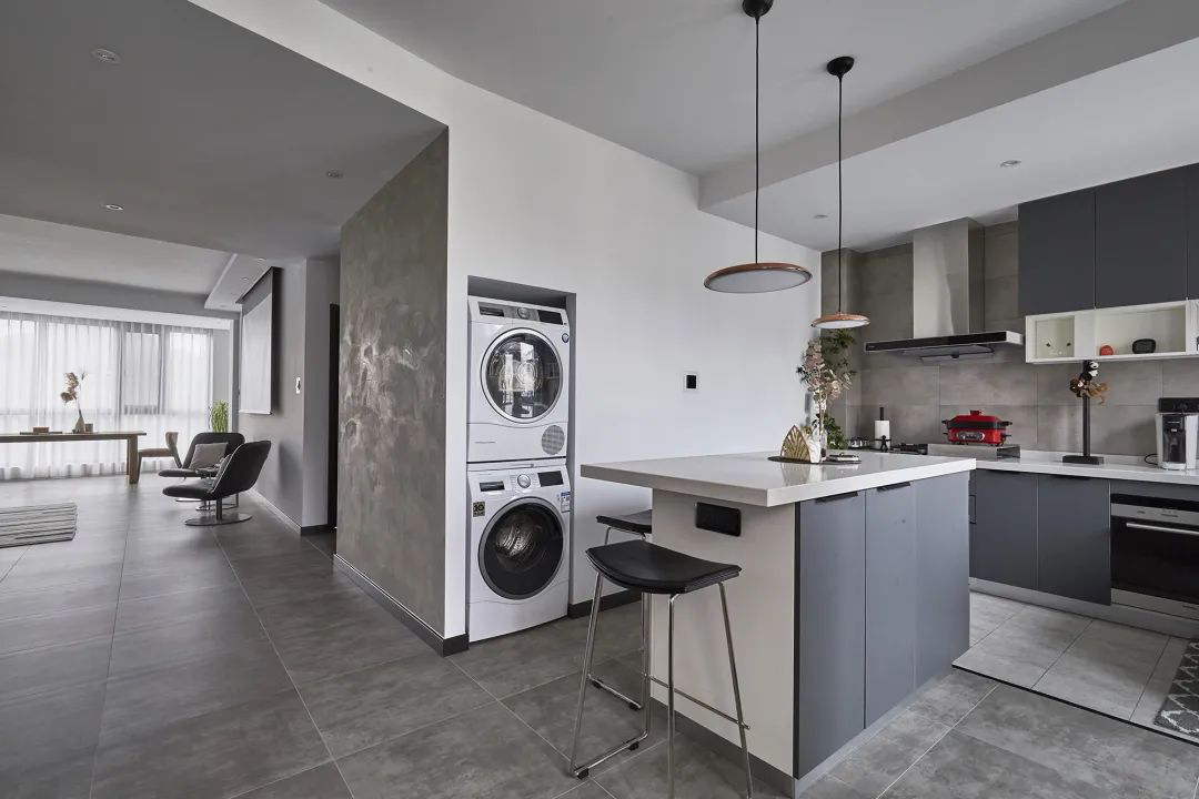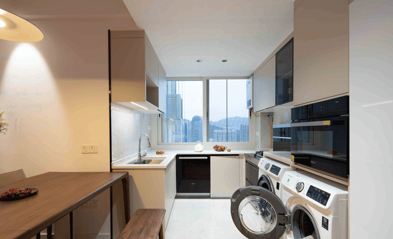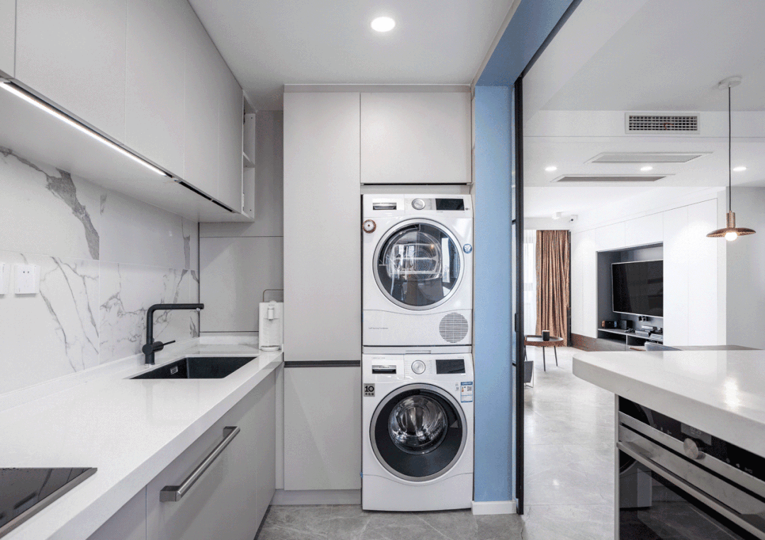 将洗衣机放在厨房附近,那我们就可以利用做饭的间隙洗衣服,省时高效。而且,能直接应用厨房原有的上、下水口,避免过多费时费力的改动。