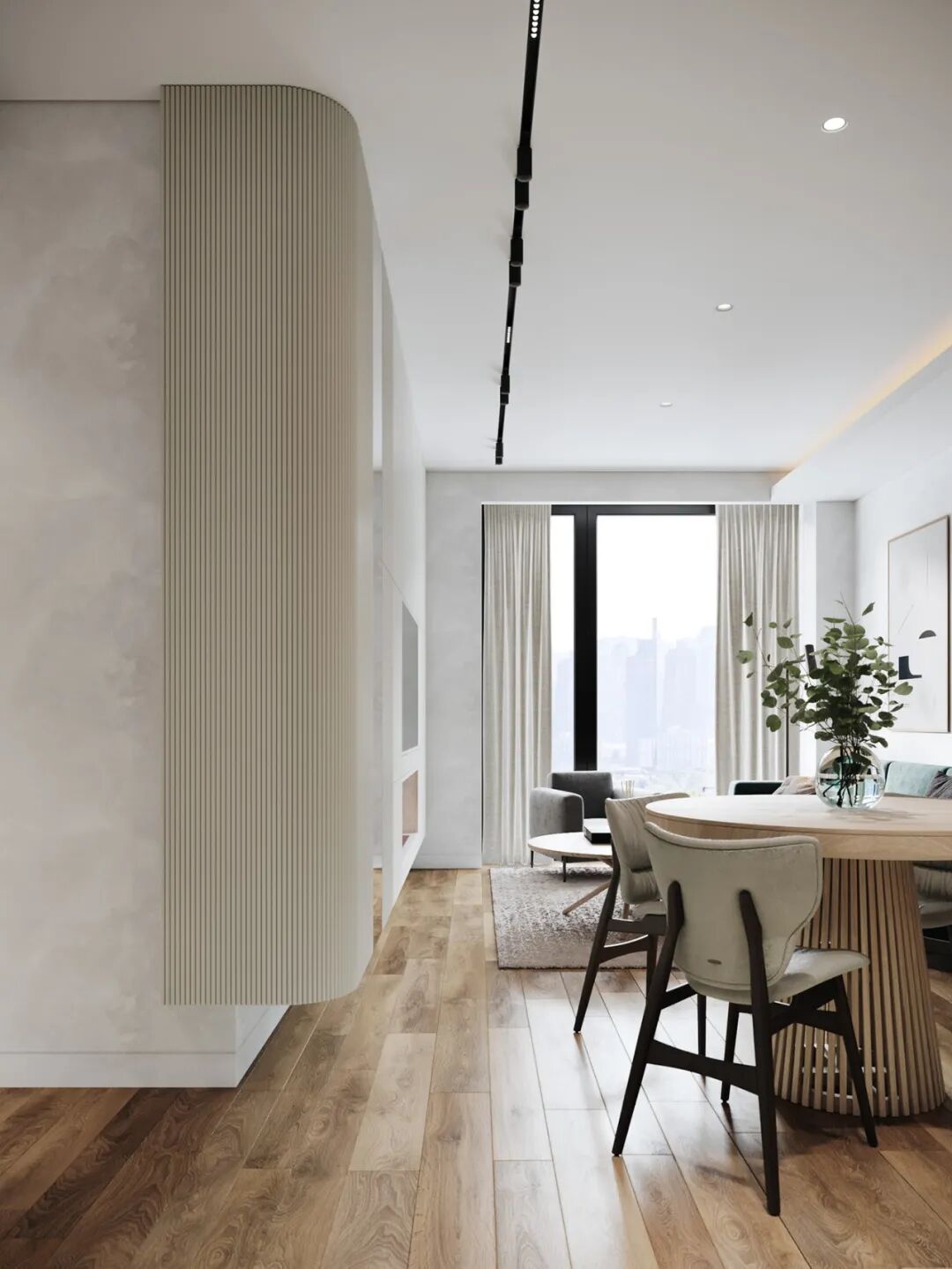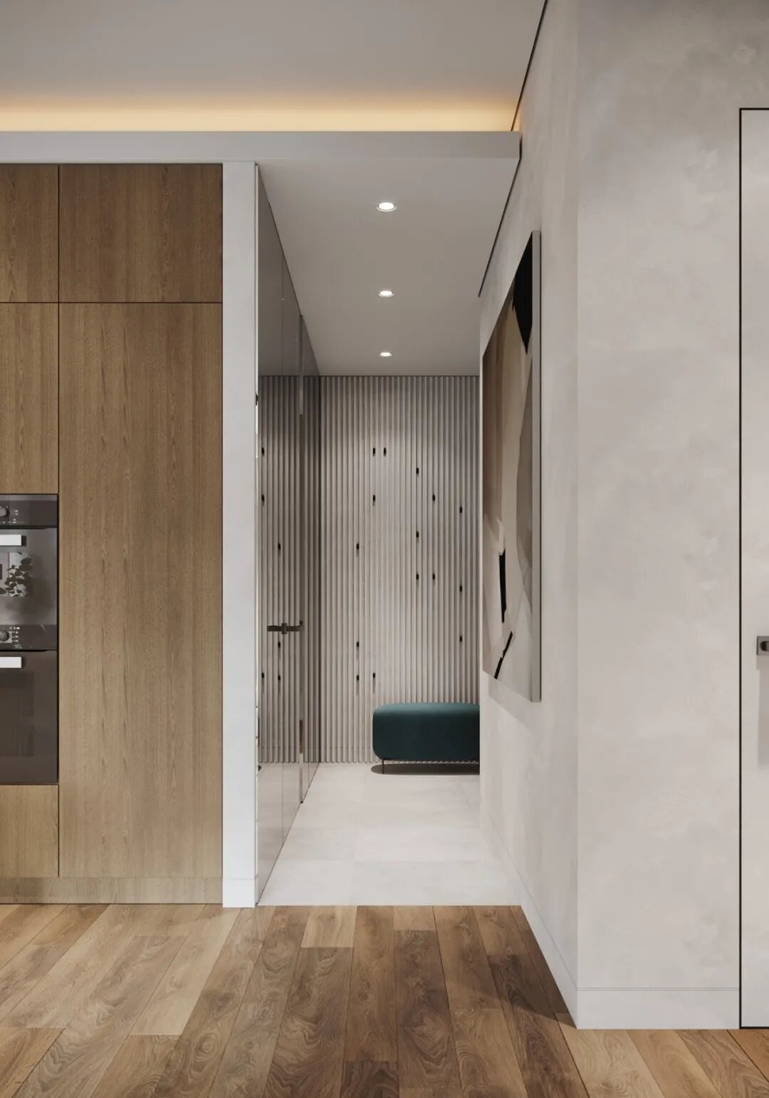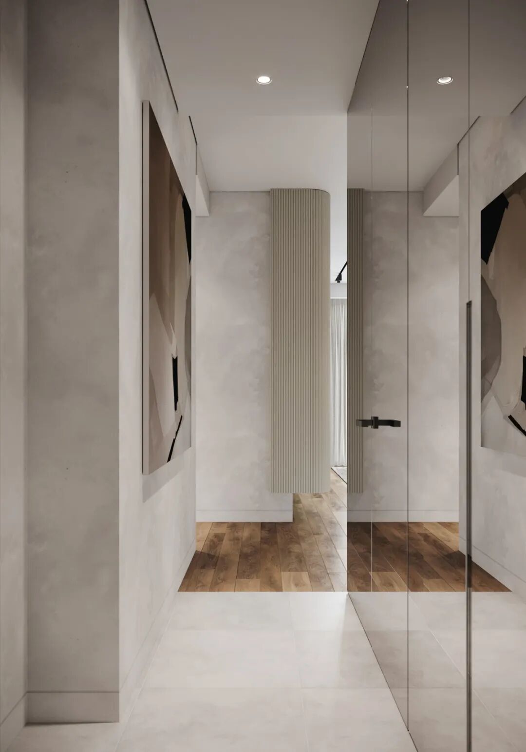 入门过道比较狭窄,这块花了不少设计师的心思,入户走廊采用了“一进到底”的设计,设计师用最简洁的手法让入门空间变得轻松不压抑,隐形式的门厅柜不仅解决了入门收纳问题,柜门的特殊材质如同镜子一般,有扩容空间的效果,体现设计师放大空间的巧思。