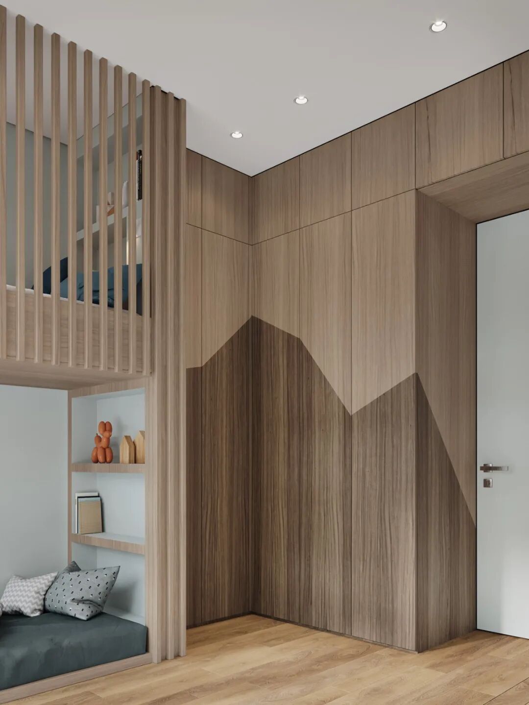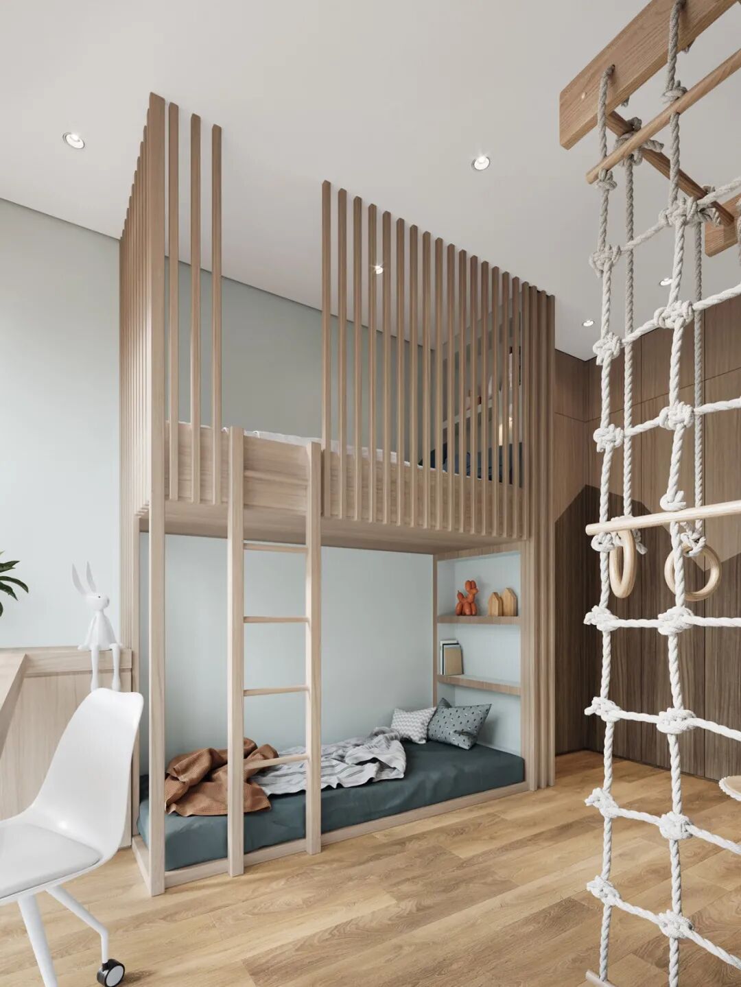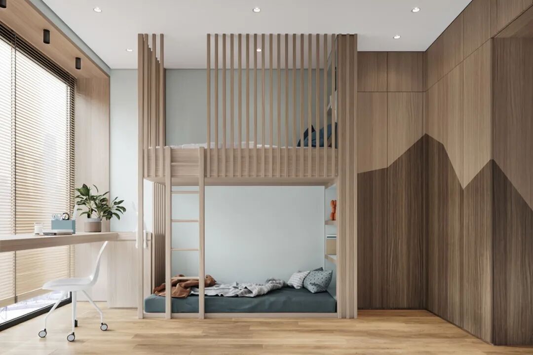 儿童房的色彩打破常规的粉蓝色,这种颜色搭配既适合孩子在学龄期前稚嫩的眼光,又能兼顾长大后的个性审美。空间中采用定制的上下铺,打造两个既亲密又独立的小空间,成长中,姐妹可以形影不离,彼此陪伴玩耍,又可坐聊交流学习心得。