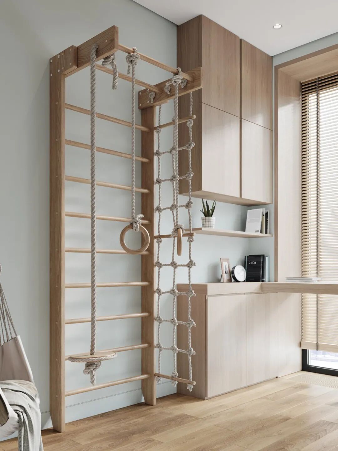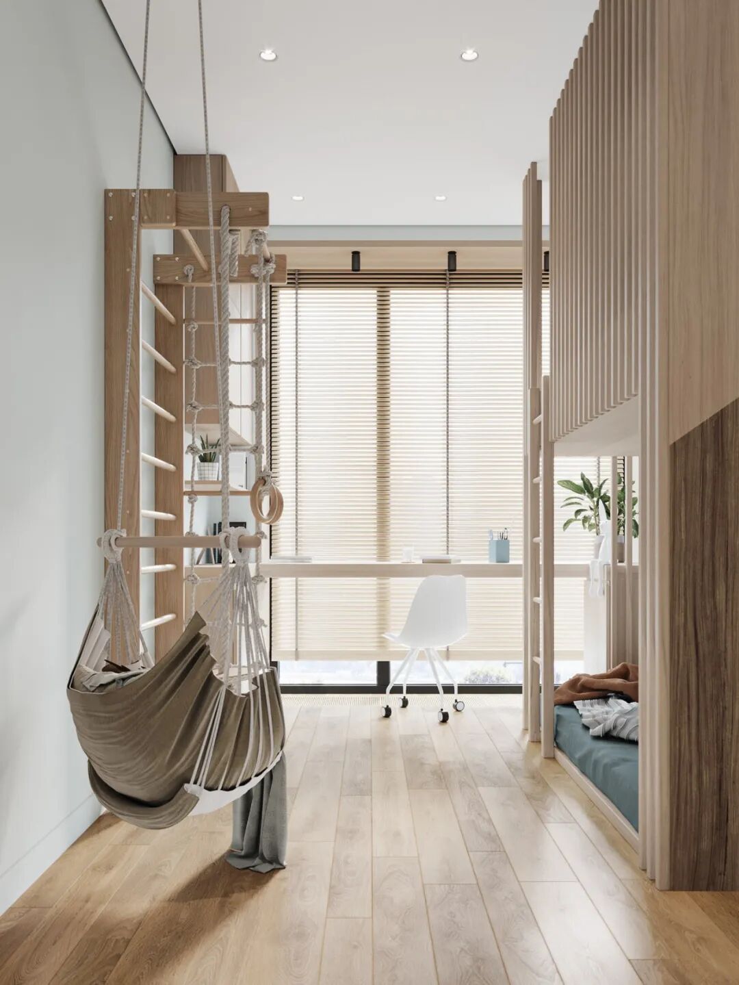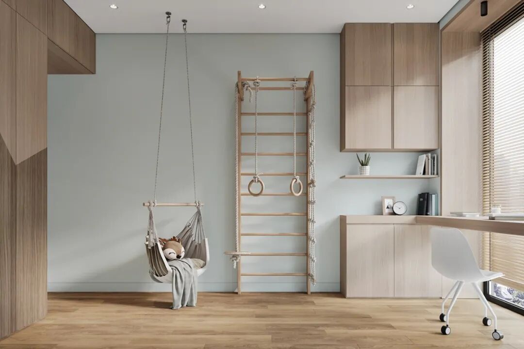 夫妻二人给女儿们营造一个有趣又舒适的儿童空间,这里好看、好玩,可以奔跑,也可以做体育运动,这应该是整个房子里最有趣的空间了。