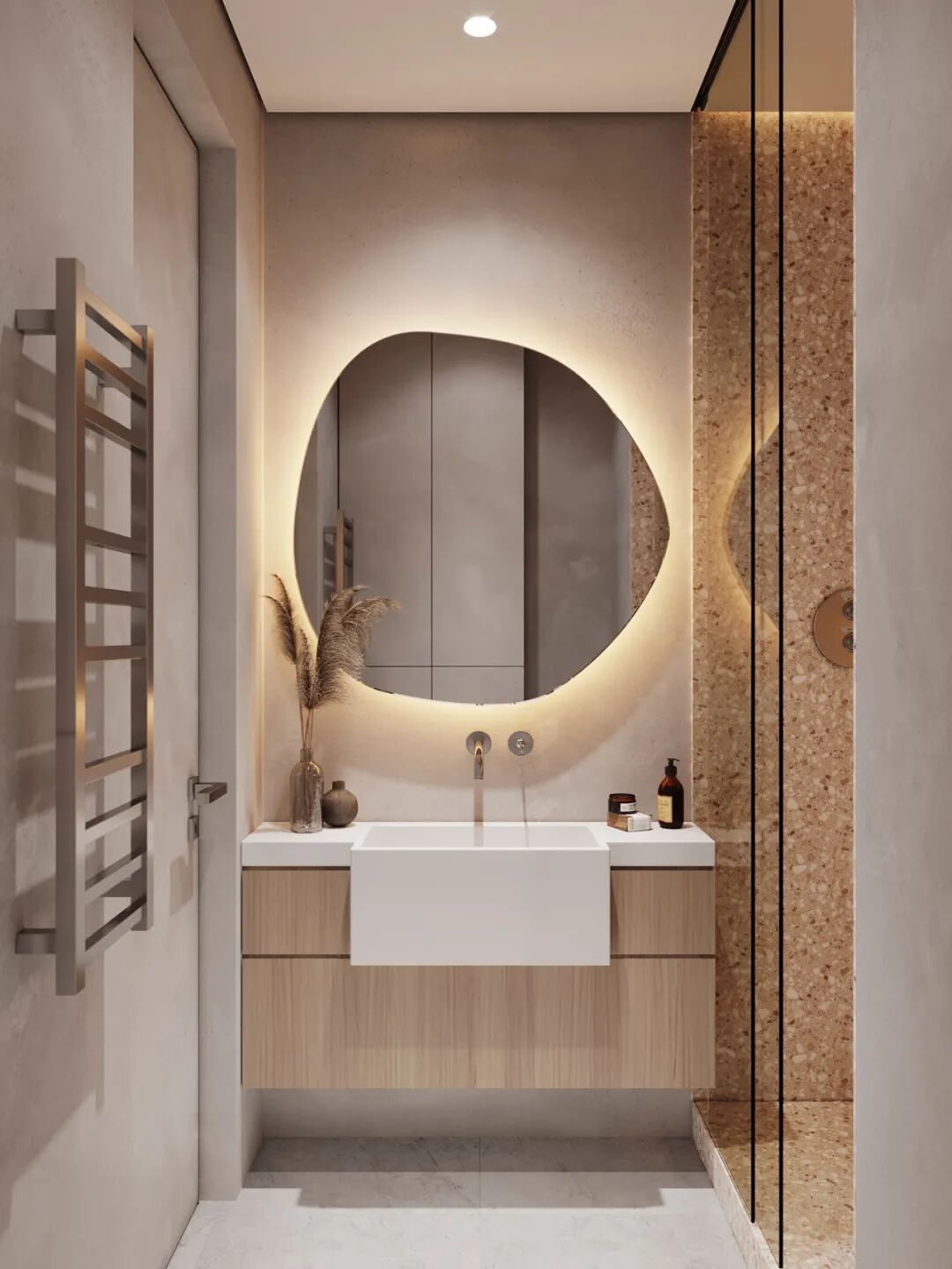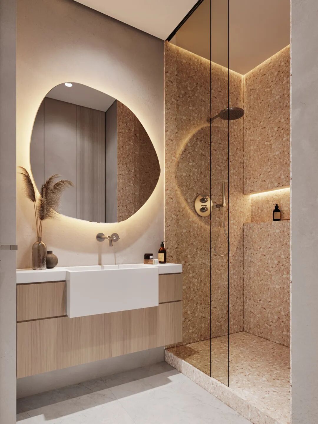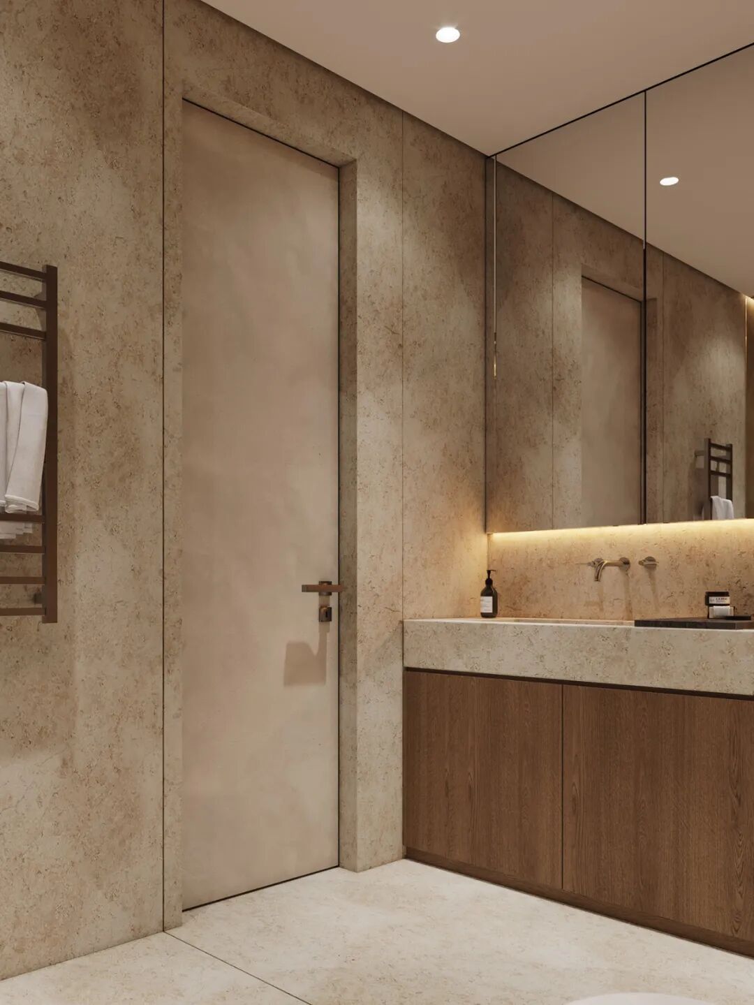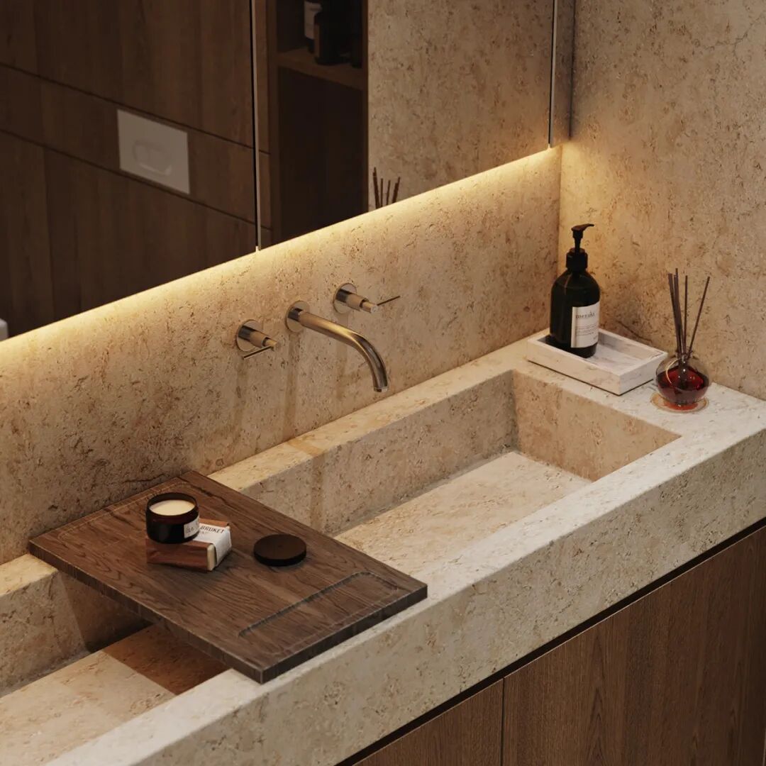 大地色系的卫浴间选用大理石台盆,处处突显着精致,台面足够宽敞,能满足夫妻二人早上上班使用,不仅节省时间有效提高洗漱效率,还可以让夫妻二人共享洗漱时光。