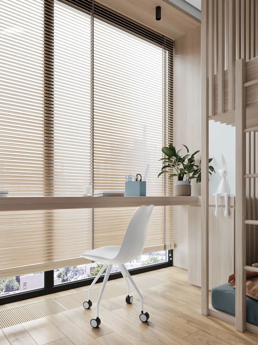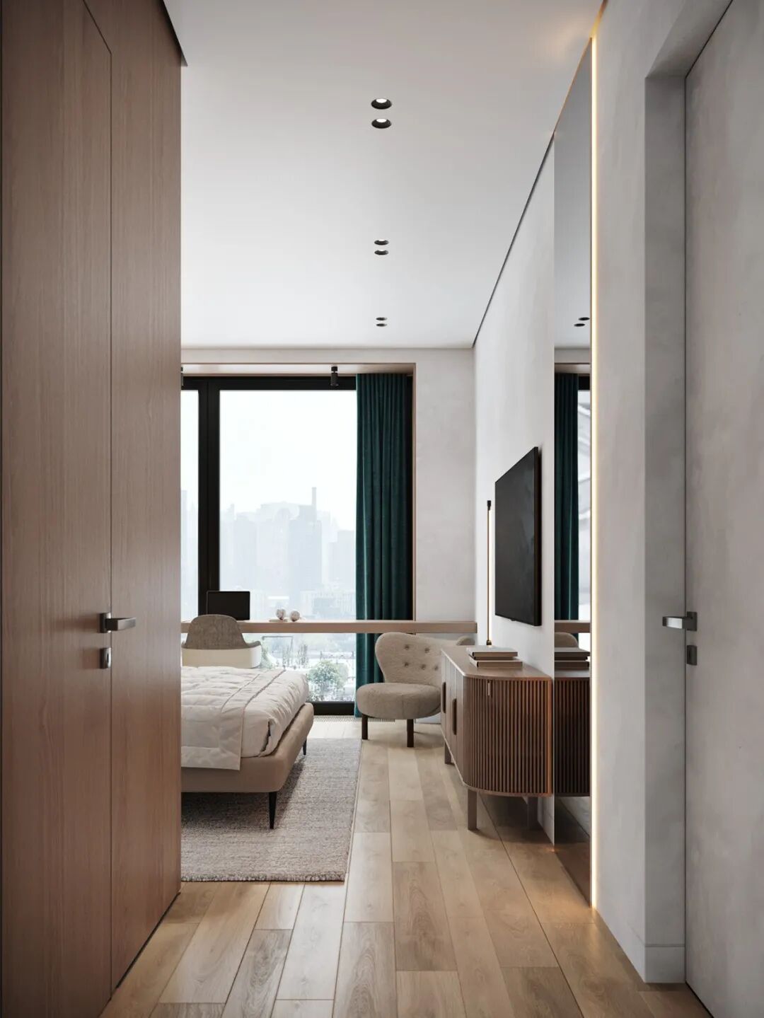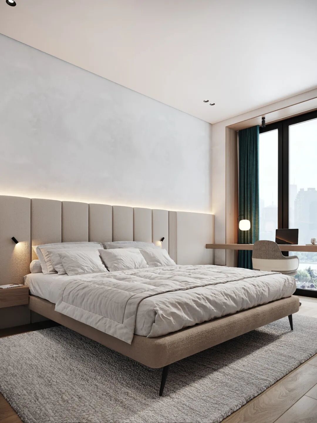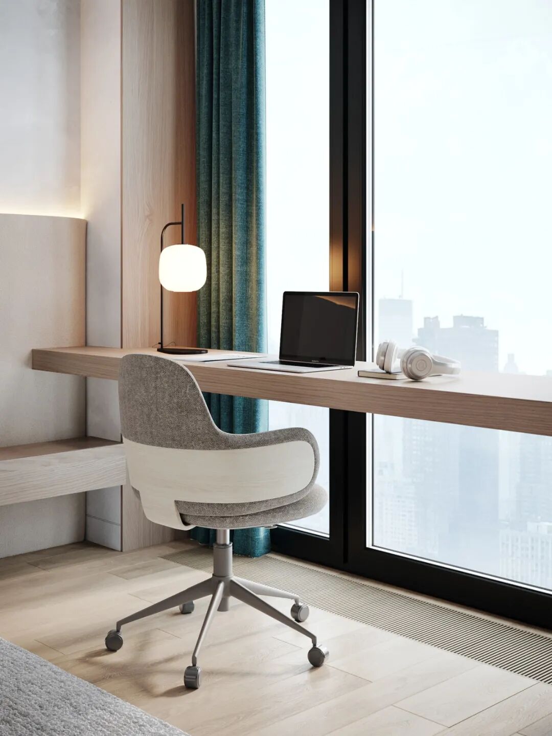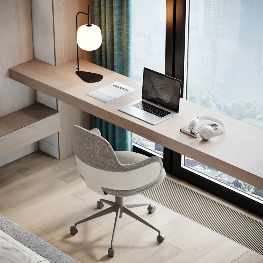 卧室超面宽的落地窗前安置了长条木质休闲桌,靠窗处光线极好,可以当化妆台,亦也可兼作办公桌,简约实用,不浪费空间,又占据了光线最佳的角落。