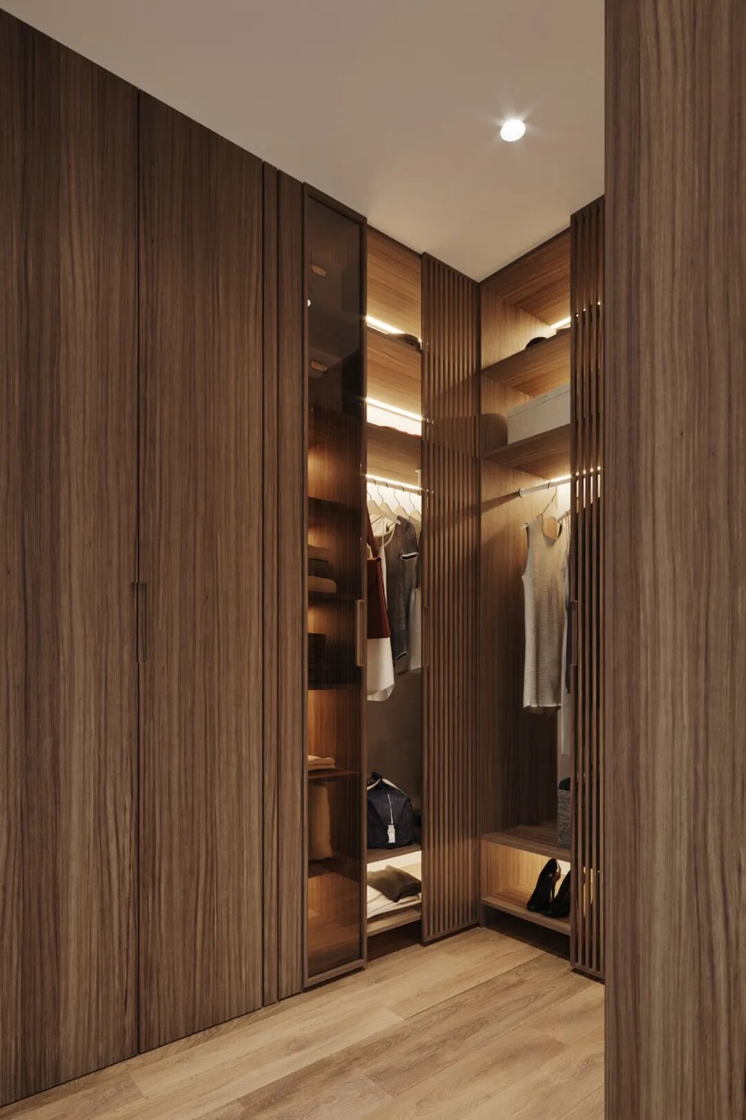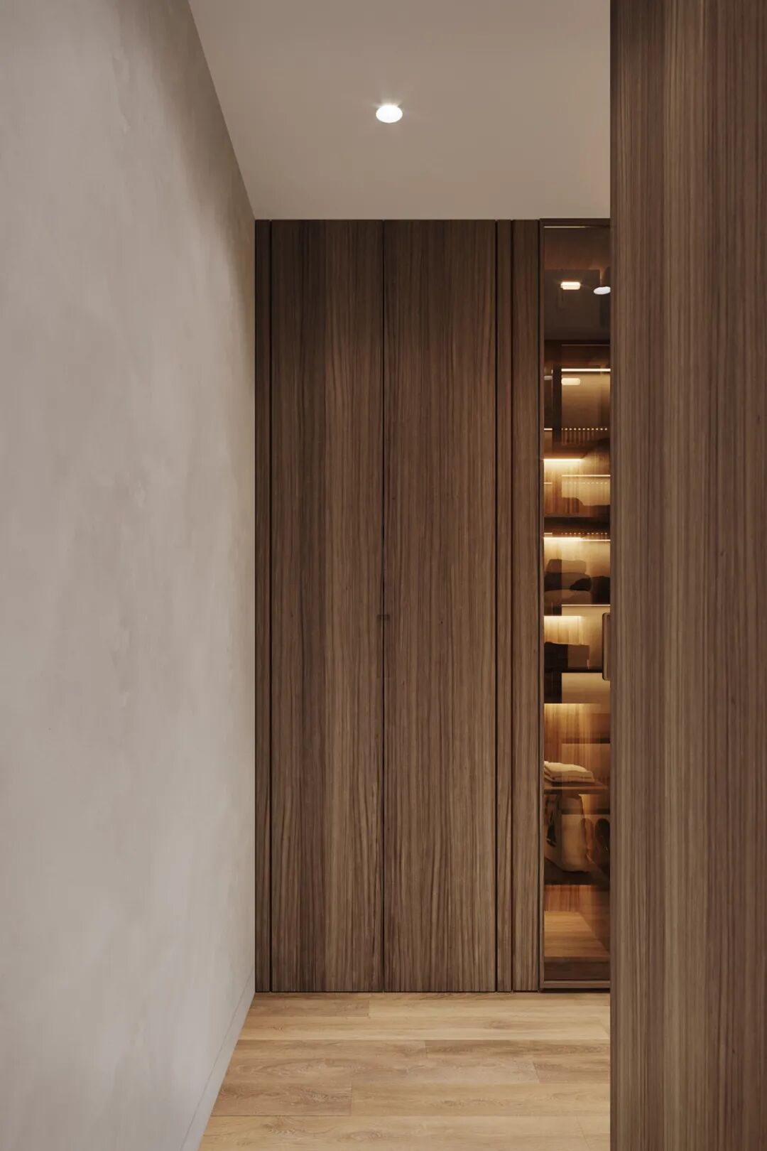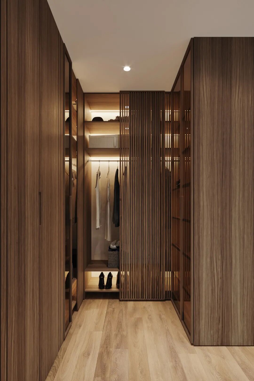 步入式衣帽间的设计也格外注重空间通透感的营造,深木色的柜体与玻璃柜门、木质格栅柜门结合,通透的材质也有利于制造空间的轻盈感,对于无窗空间,充分利用不同材质的组合,也是减轻空间包裹感的小心机。