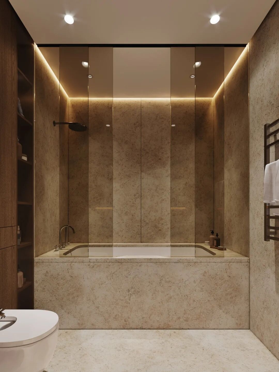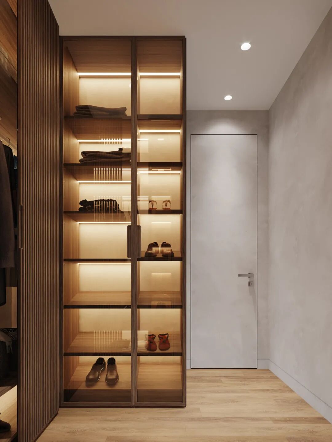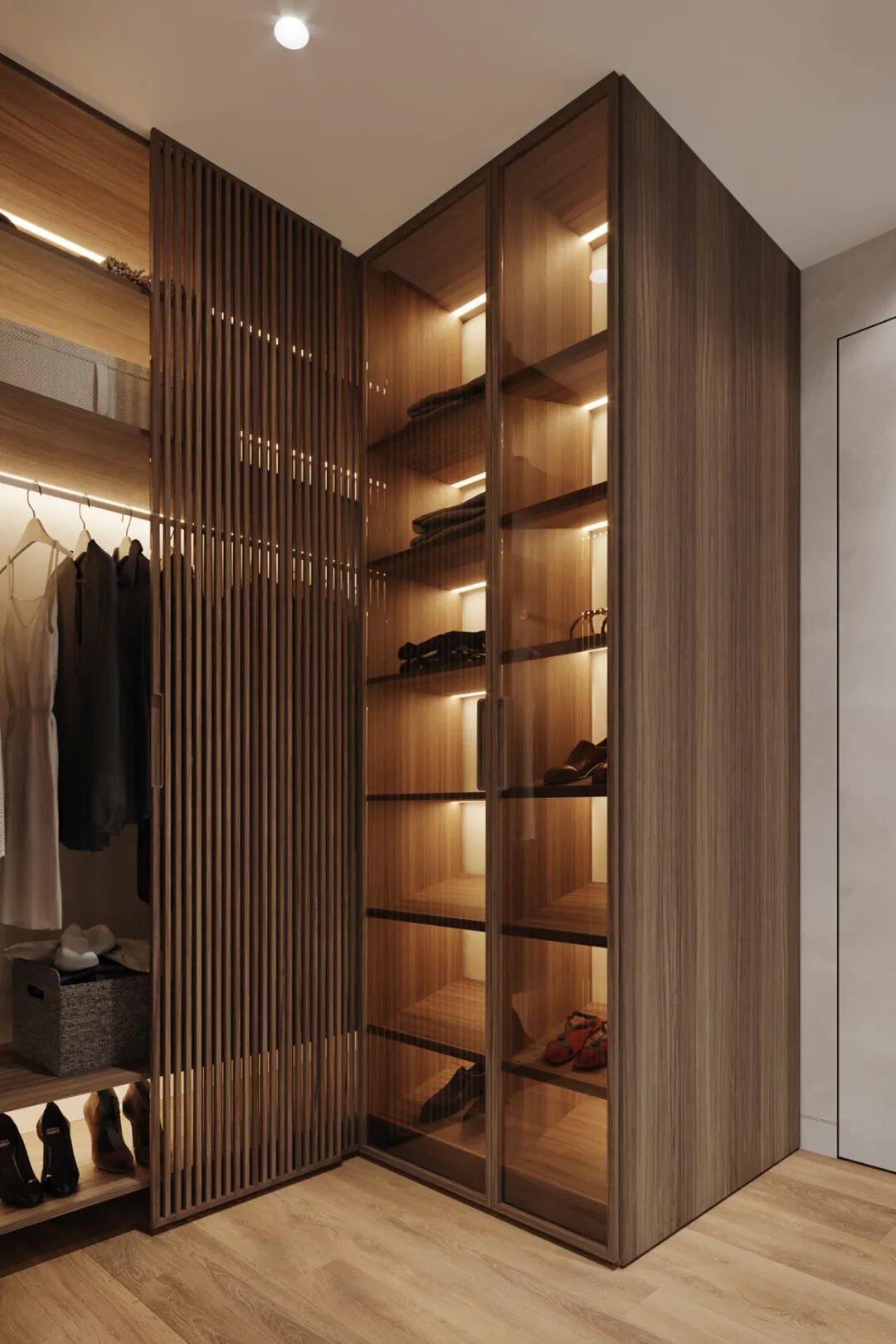 步入式衣帽间的设计也格外注重空间通透感的营造,深木色的柜体与玻璃柜门、木质格栅柜门结合,通透的材质也有利于制造空间的轻盈感,对于无窗空间,充分利用不同材质的组合,也是减轻空间包裹感的小心机。
