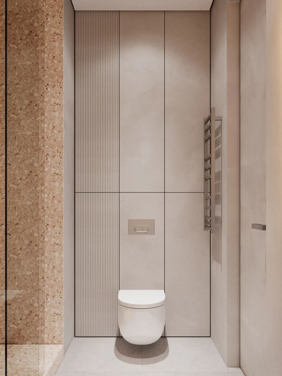 卫生间面积不足5㎡,业主还想做成干湿分离的设计,设计师将洗漱台与马桶分别放在对立的两面墙上,采用壁挂式的设计,小巧轻薄的洗漱台搭配微水泥的墙面,视觉上不显局促。自带颜色的玻璃隔断,既节省了空间又补充了光源,而且通透的玻璃不仅能够有视觉扩容的效果,也让空间显得高级感满满。