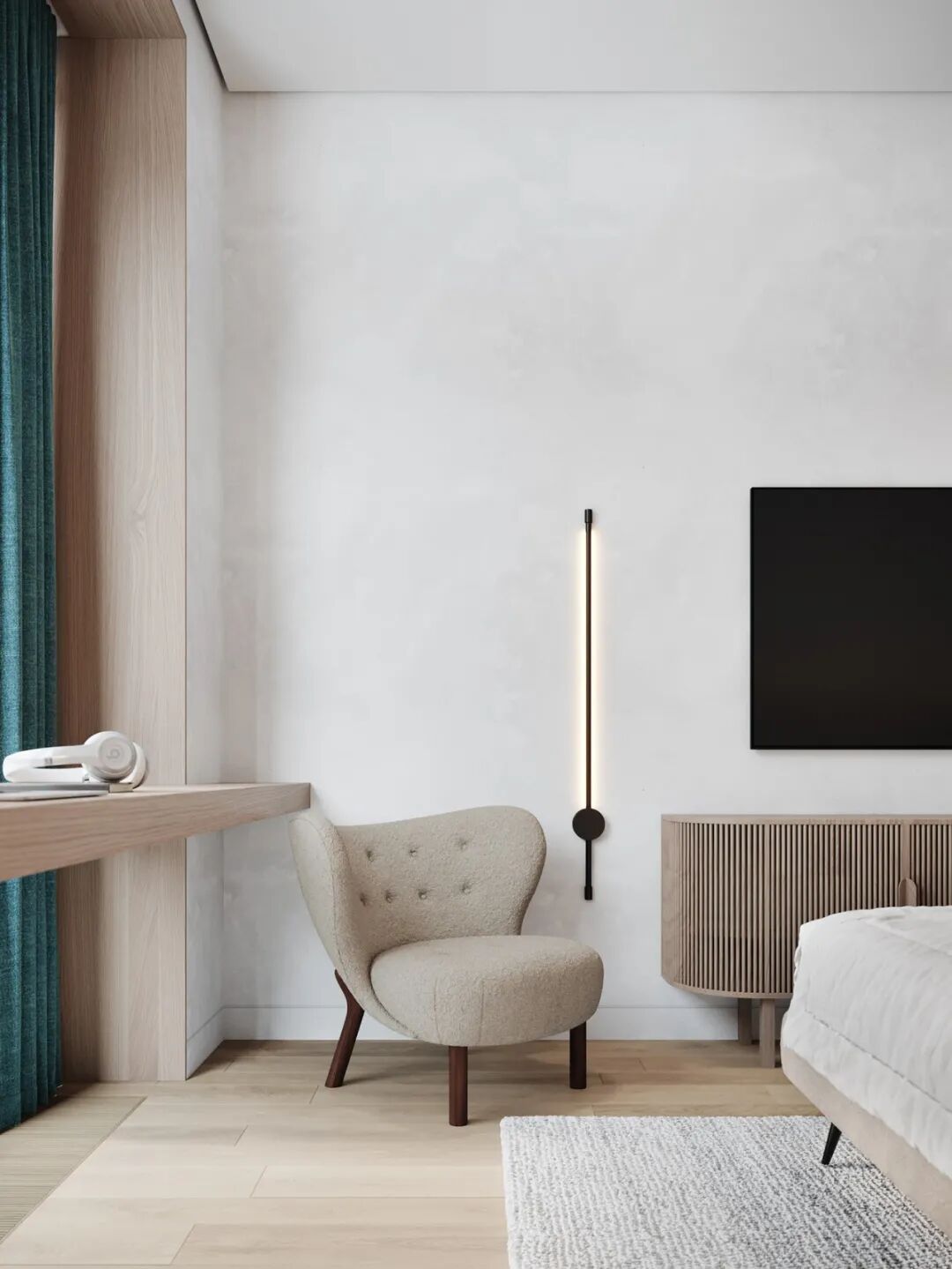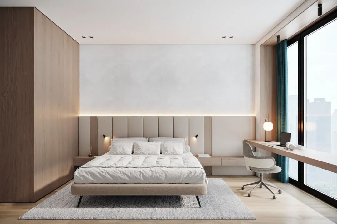 原木+白色为卧室主色,整体给人一种干净、纯洁的能使人感到放松的感觉,大大的软包床头不仅给主人睡眠带来安全感,也很好的装饰了床头背景墙,让床头不再单调。