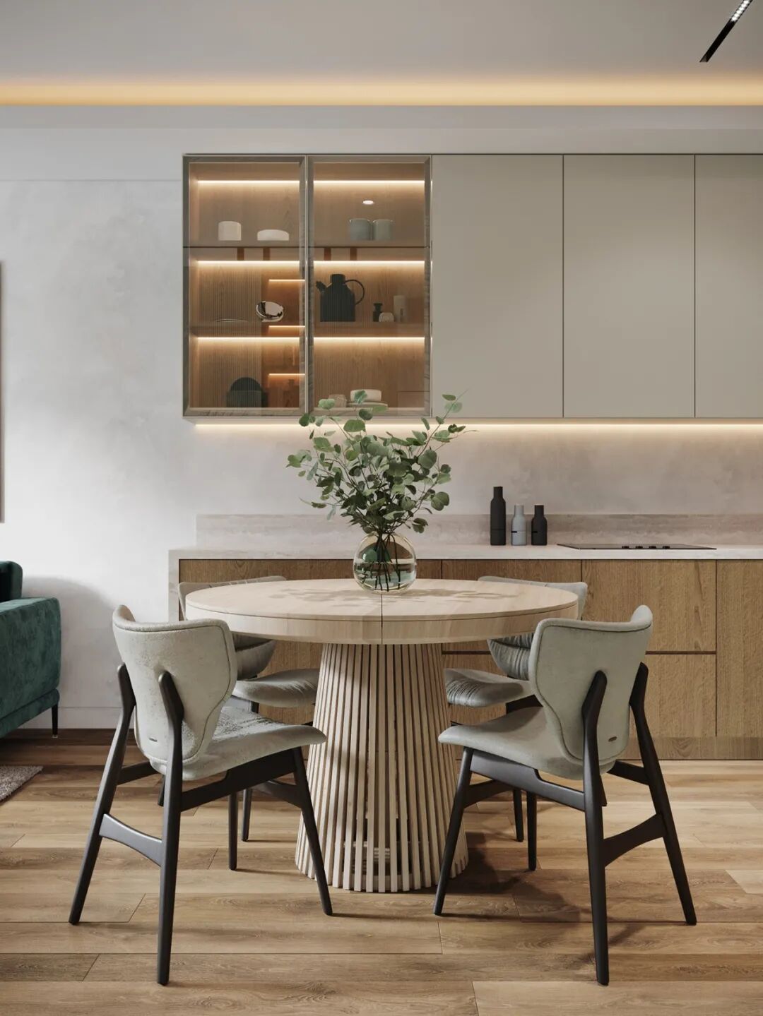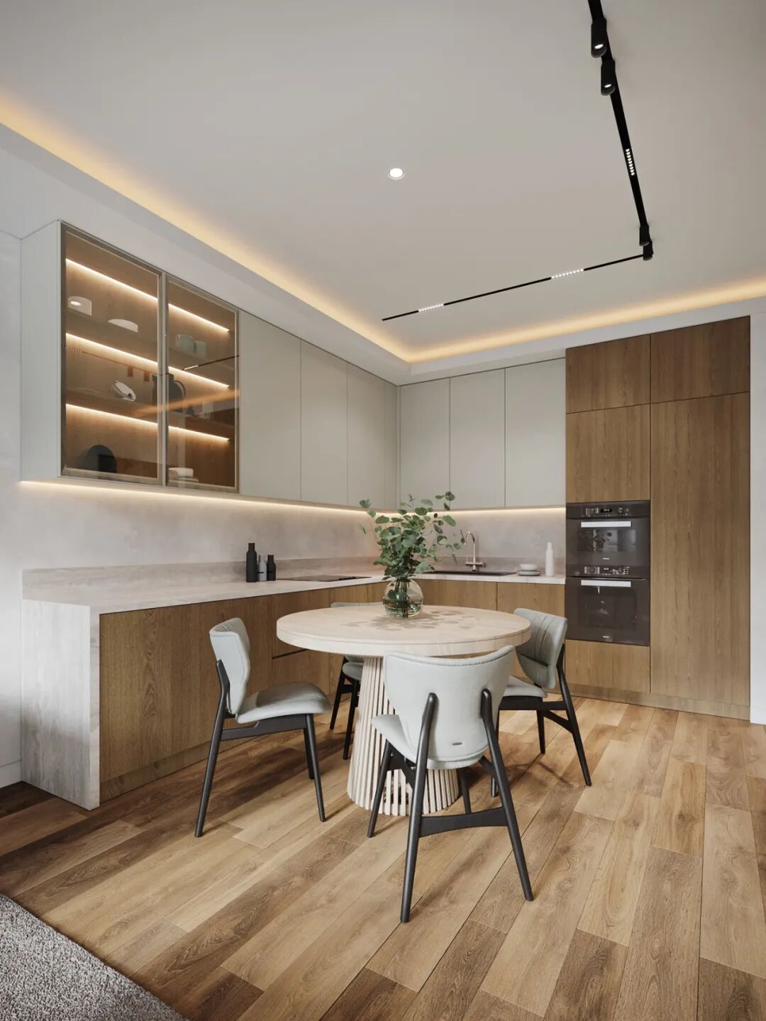 开放式的厨房,让餐厅有了容身之处,业主挑了木质的圆形餐桌,正好够一家4口围坐用餐,温润的木色不仅能让人保持舒适的好心情,也能提升人的食欲。