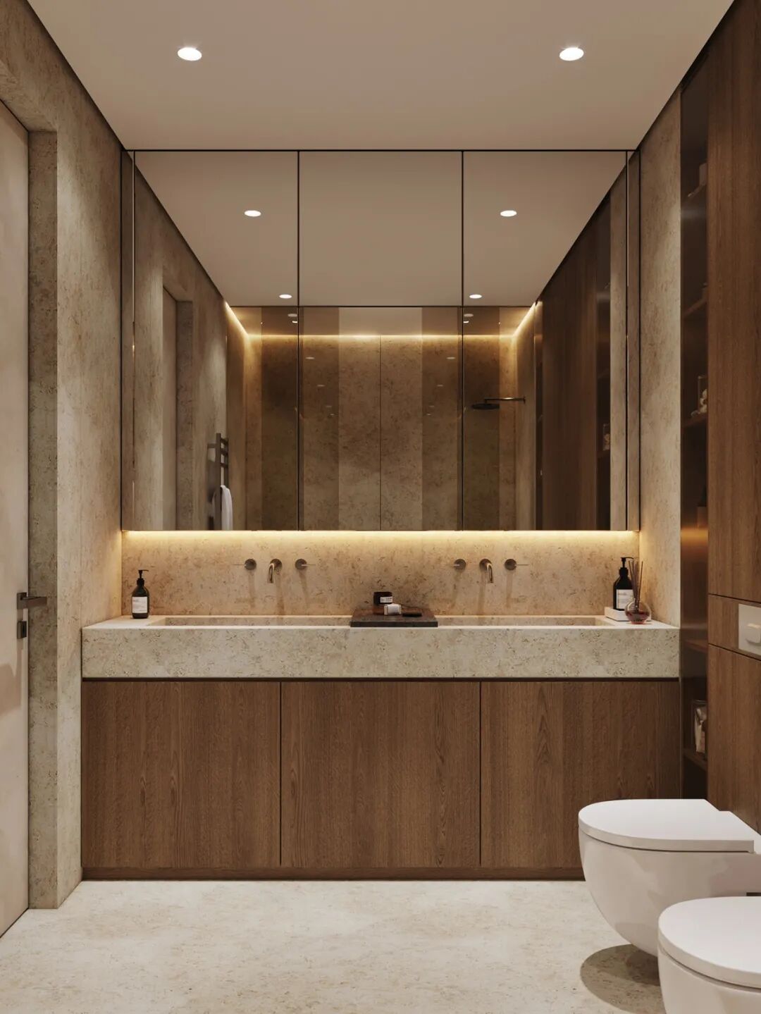 主卧卫生间运用到双人位置洗手台,大大的定制台盆,实用简约且增加使用的便利性,一整排镜面储物柜,能容纳所有凌乱的洗漱用品,让卫浴空间保持干净整洁。