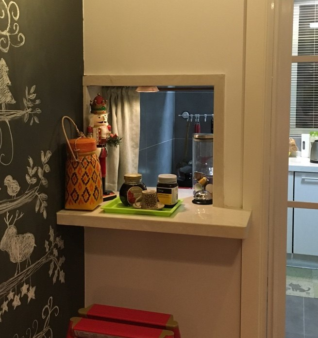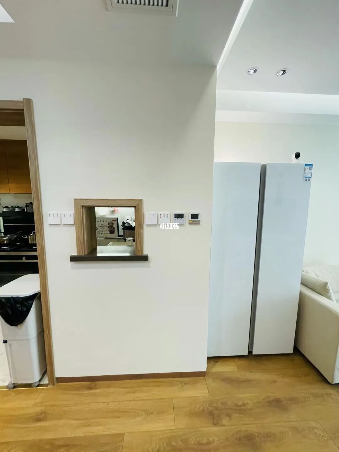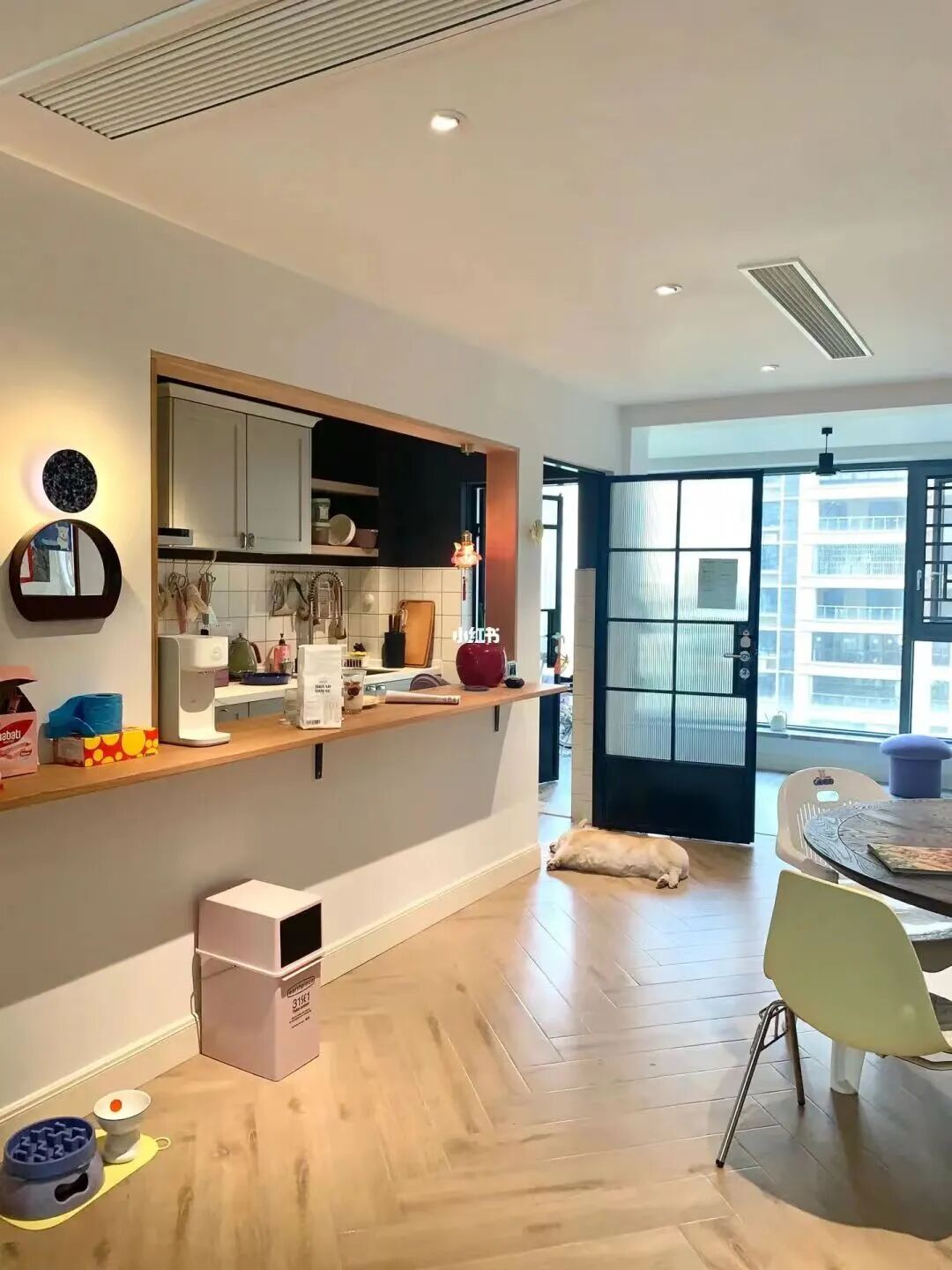 @小狮子:我家餐厨空间的动线其实还好,但由于厨房比较小,就把冰箱放在了客厅,平时拿取蔬菜和食材时不是很方便。灵机一动在厨房墙面开了洞,做了个小小的出餐口,用来传送菜品和食材,每天少走超多路。