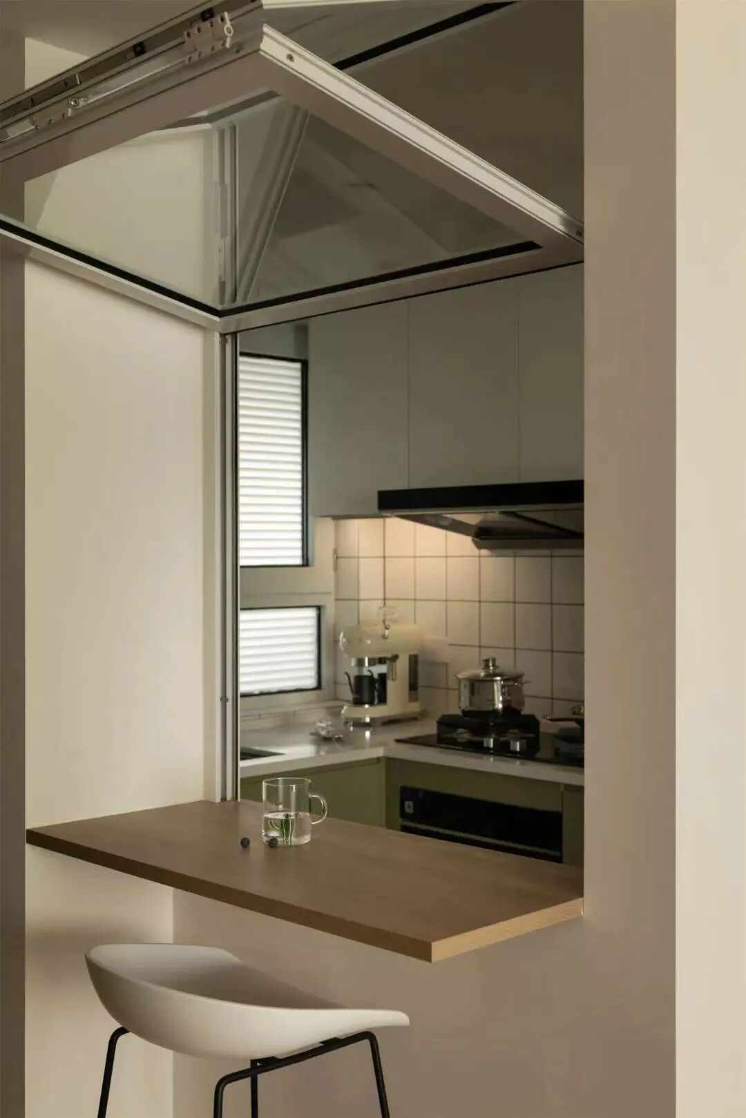 如果担心跑烟,可以在洞口装上卷帘或安装上窗户,日常打开通风,做菜的时候再关上,使用方便。也可以加上一扇推拉窗户,防止油烟跑出,还不影响厨房光线。