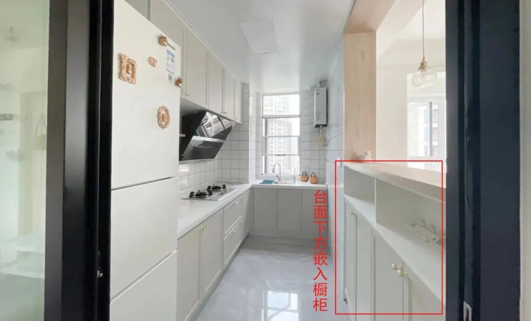还可以先开一个洞再嵌入橱柜,利用台面下方做收纳,将餐具、碗筷等放进去,拿取更方便。