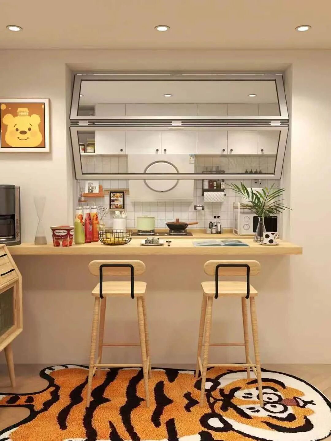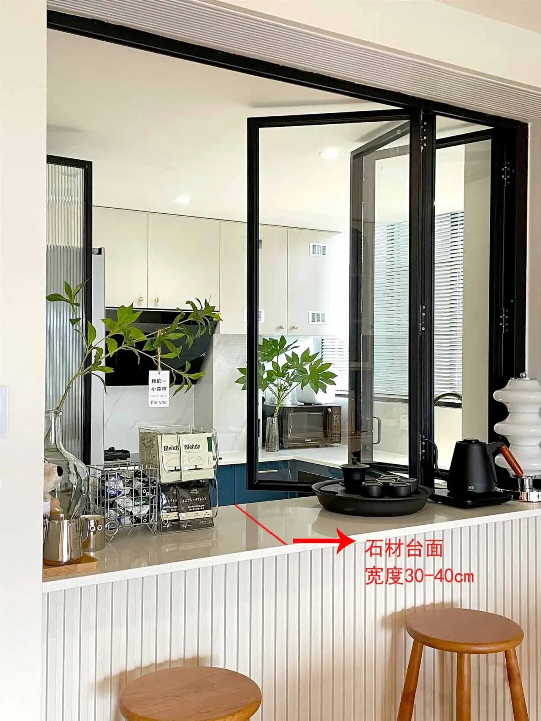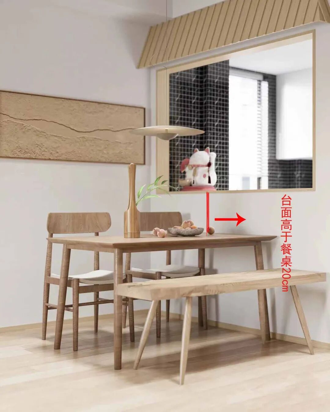 洞口外大多会摆放餐桌,建议餐桌比洞口台面稍微低20cm左右,伸手取东西的时候也不用担心碰倒餐桌上的物品。