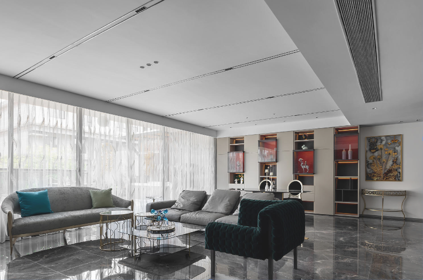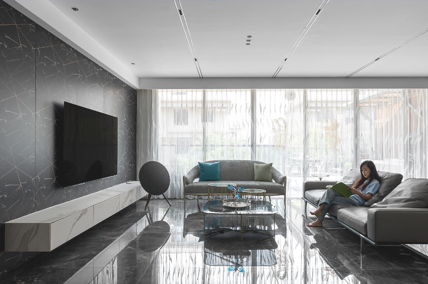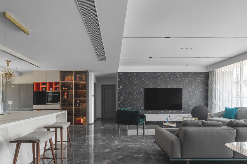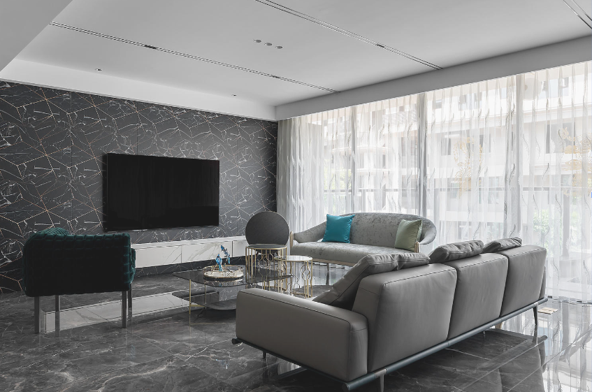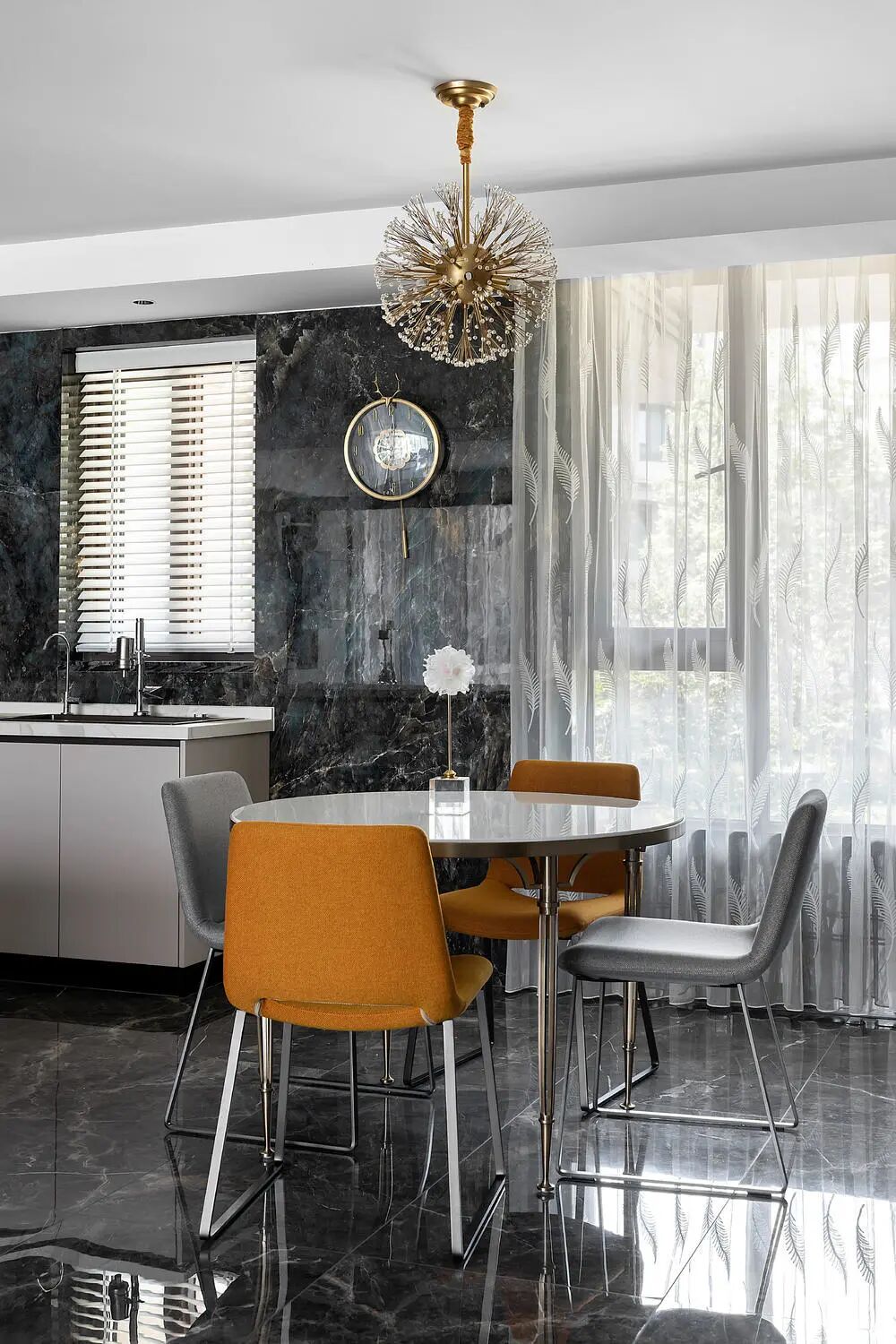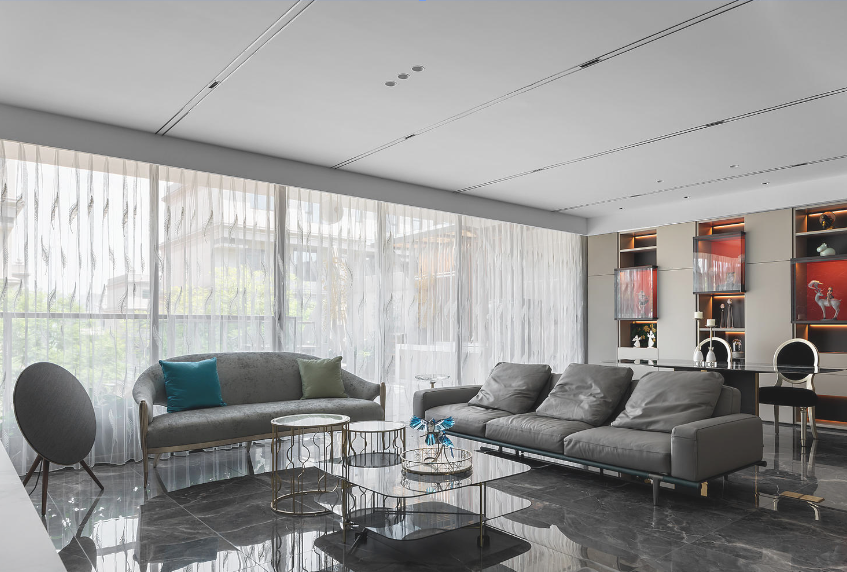 客厅主体采用黑白灰的主色,泛着抛却繁杂的气息。让人从都市的喧嚣中感受回到家的温馨。不复杂的颜色,利落纯粹的线条,象征居住者的沉稳大气。黑白灰中增加了金属,大理石等元素,让空间增加了一分“奢”感。