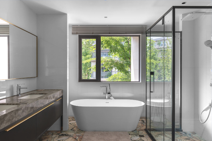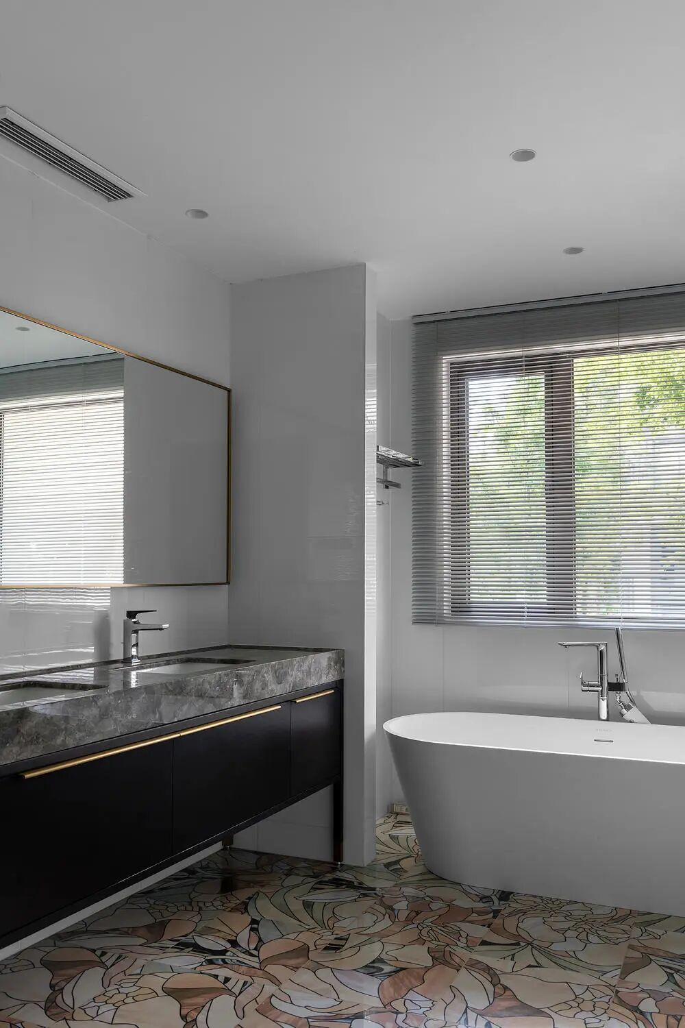 卫生间主调通透明亮,运用深色的洗漱台使得空间更加协调。兼具时尚与复古气息的花砖,如同服装上的配饰,为空间描下点睛之笔。
