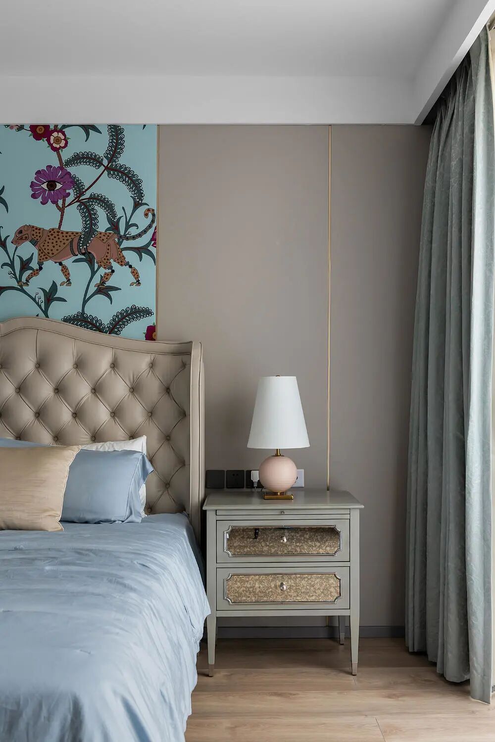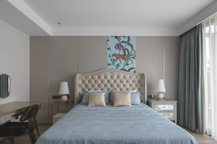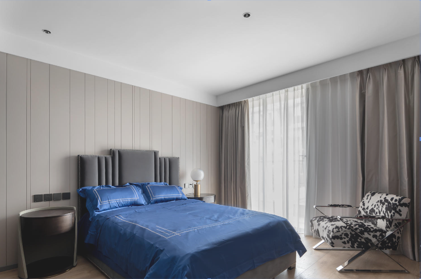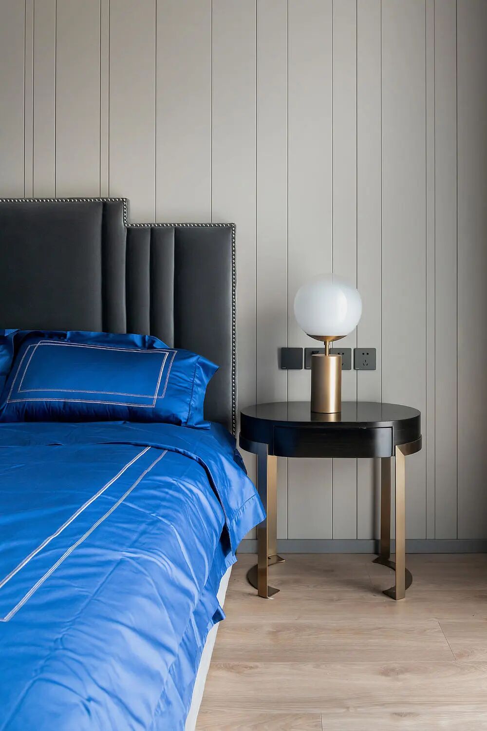 背景墙浅咖色墙板无规律分割使空间更加有节奏感,搭配深灰色的硬包,大气自然。宝蓝色的床品让卧室整体看上去明暗有致,充满品质感。