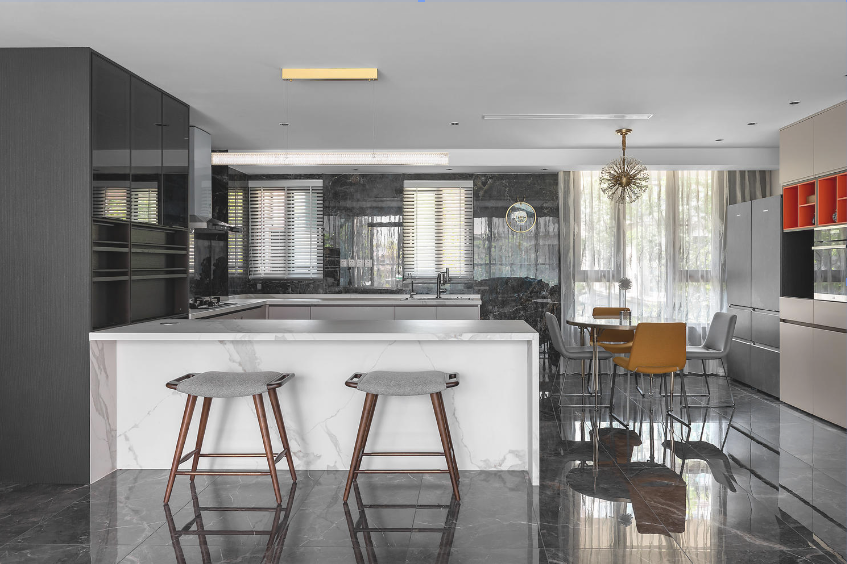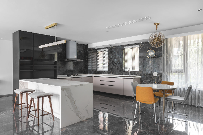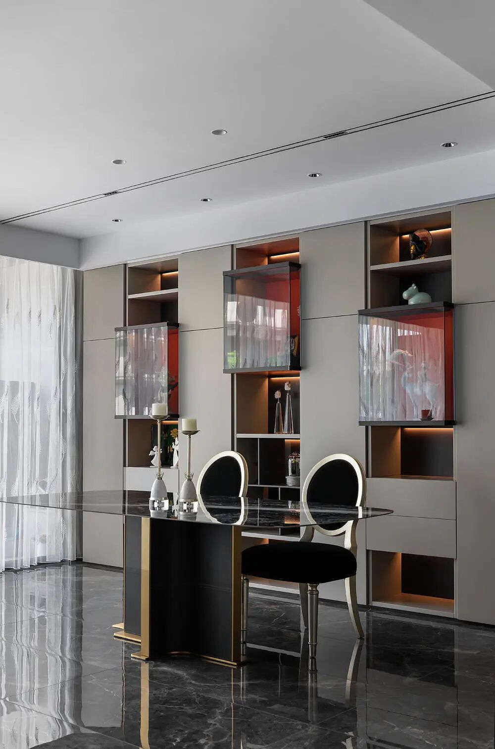 厨房整体简约明亮,黑色柜体搭配白色大理石岩板,优雅温厚,稳重内敛。开放格与玻璃柜门的组合,搭配隐藏灯带,温馨而又有视觉层次感,简约而不简单。