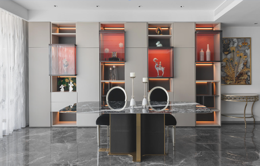 很多时候美好生活不是物质的堆砌,而是随时随地能在细节之中感到美的享受。空间中运用了黑色底板、红色亚克力板搭配增强了设计的冲击力和表现力、避免整体的单调感,更能够表现出异乎寻常的力量,给人眼前一亮的视觉体验。