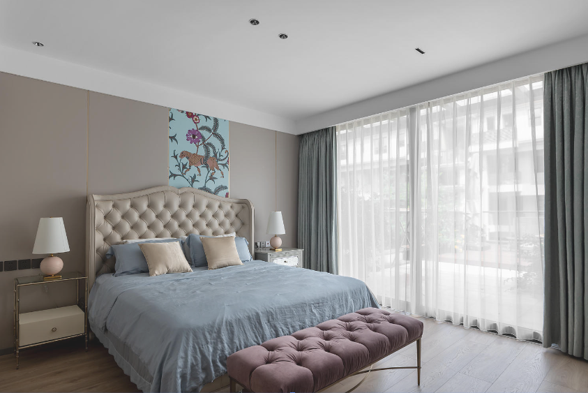 卧室以暖色为基调,清新淡雅的布局,轻奢感的基调和欧式家具搭配,形构出一个格调高雅的精神宁谧地带。柔和的光影赋予了它慵懒舒适的氛围,自由的艺术气韵在空间中流溢,交织出空间的韵律,演绎着现代优雅的品格。