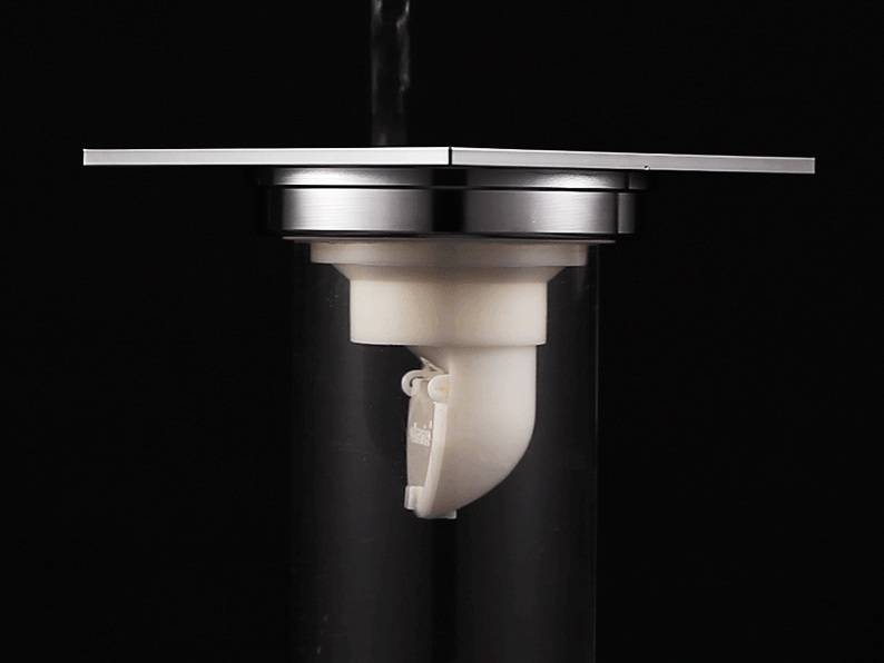 比如,侧开式重力翻板地漏。这款地漏内部的盖板在静止状态下是关闭的,当有水流时,水流会冲开盖板,水流完后,盖板会受重力作用自动回位,磁力还会帮助盖板牢牢吸附,有效防止异味返回。
