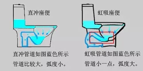 马桶有直排式和虹吸式两种,指排式的管道粗,但是弧度比较小,水封面积小。虹吸式虽然管道窄,但弧度大,水封面积也更大。相比之下,虹吸式马桶的防臭也更强,所以建议大家选购马桶的时候,选择虹吸式马桶。