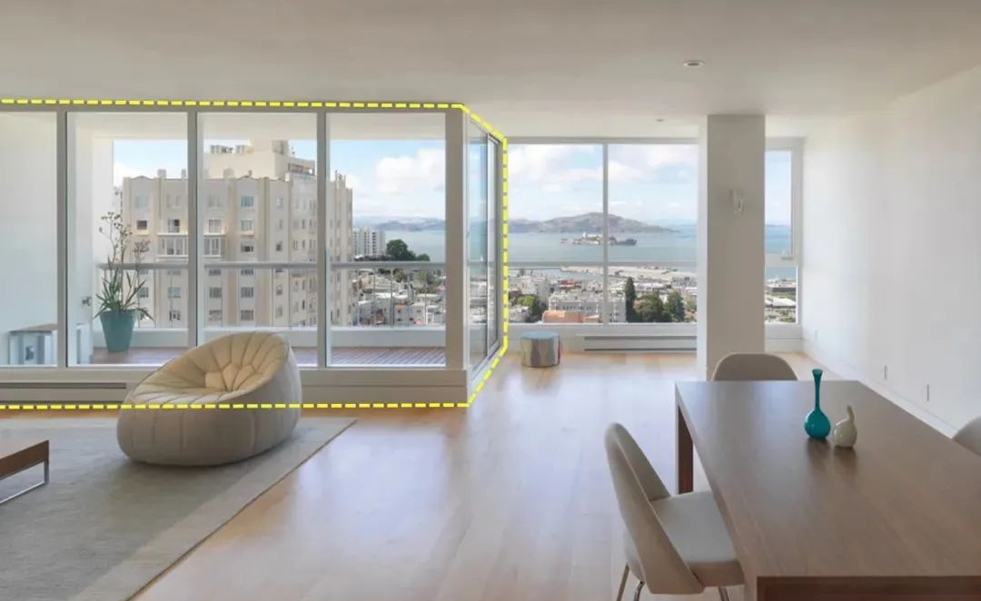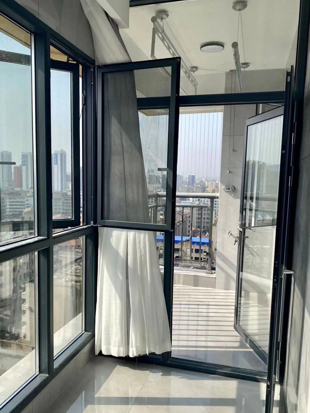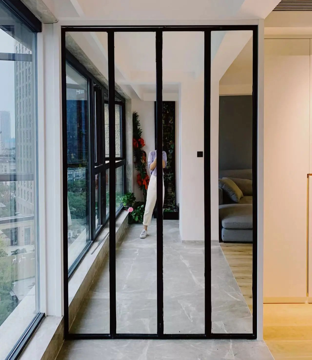 @陈辰辰:对应客厅的部分用断桥铝封起来,中间选择平开门做隔断,比推拉门更省空间。