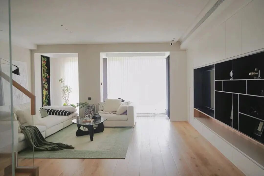 @是南南小姐姐:我家阳台和客厅打通后,洗衣机放在电视柜延伸部分,从客厅看到窗前美景一览无余,完全看不见晾衣服。