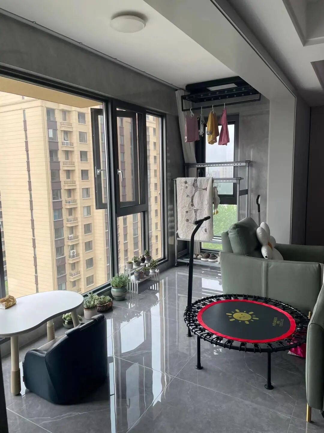 @李琳:我家有个7米长、1.5米宽的阳台,装修时和老公展开了激烈的讨论,他是封阳台党,要有咖啡角,在懒人椅上惬意打发独处时光;我是不封阳台党,要晾衣服和养花。