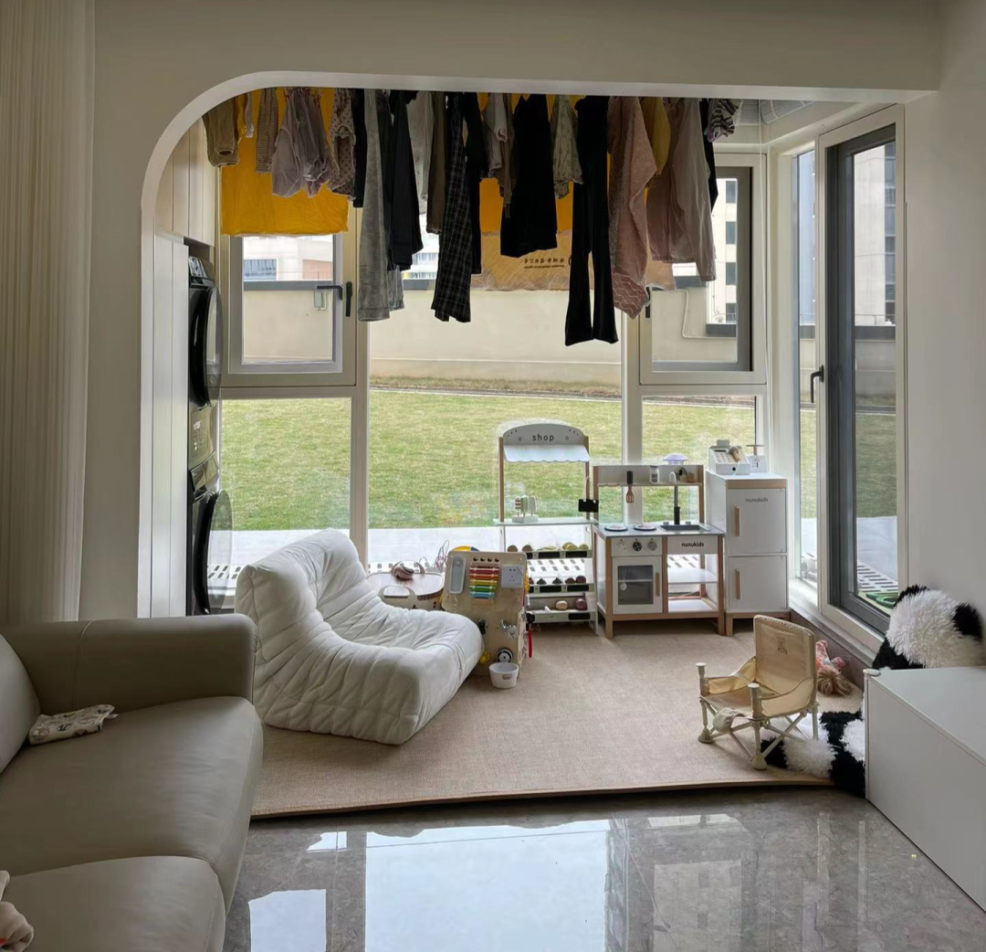 大多数传统家庭中,阳台最日常的功能是晾衣服。我将阳台打通之后,坐在客厅瞟到阳台晒的内衣裤衩,非常尴尬。家里花重金装修的家,一下子掉了好几个档次。