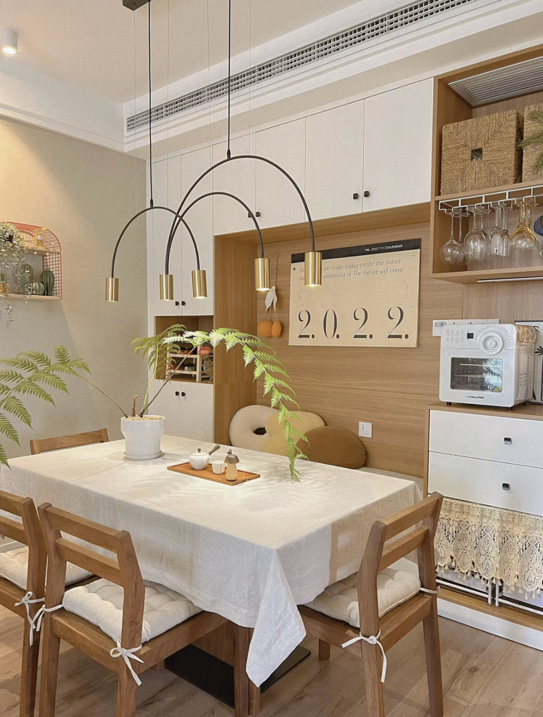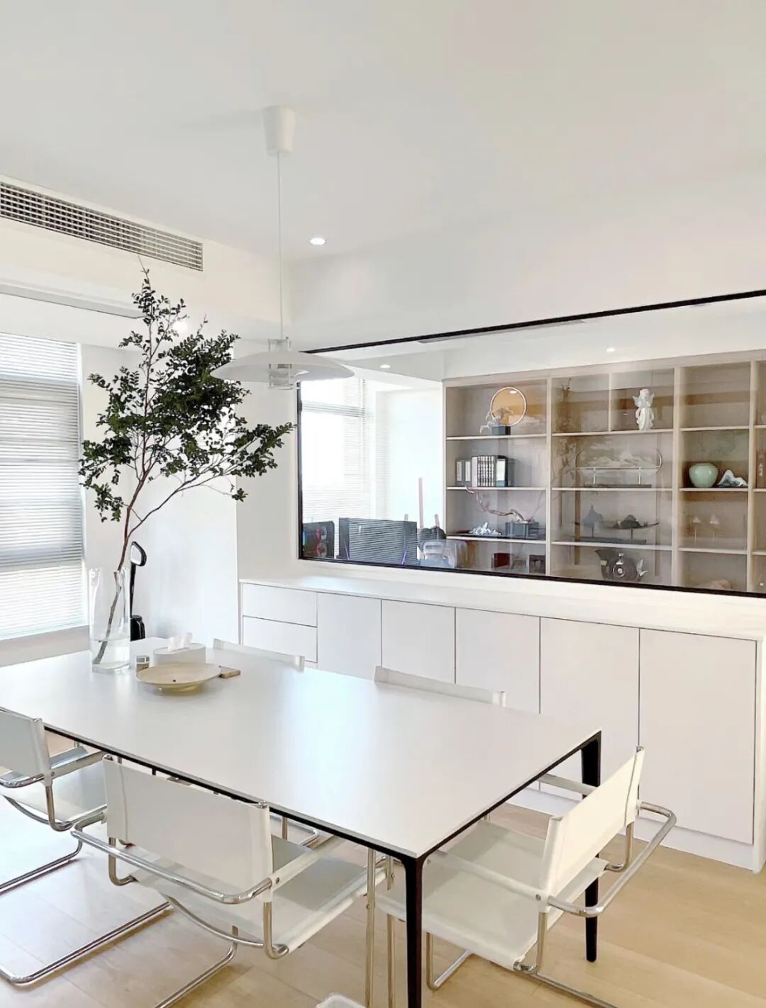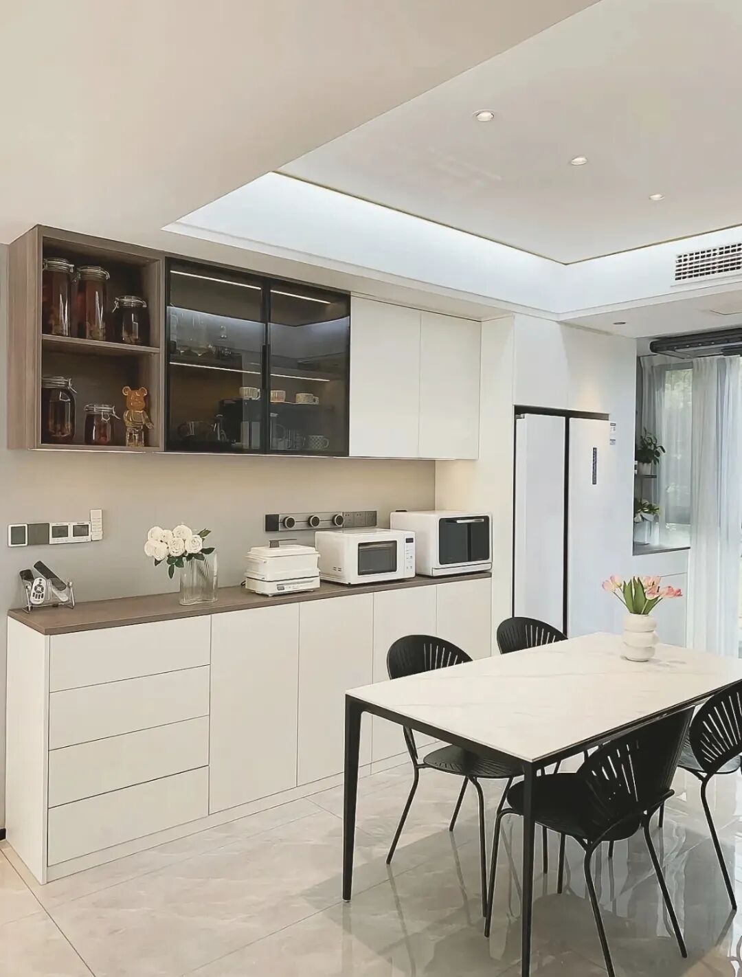 成品柜比较适合前期没有定制餐边柜,后期想要安装的的家庭。它的好处就是可变动性强,靠墙矮柜形式,视觉更灵活,空间会显得更宽敞通透,同时台面也能满足水吧台以及随手置物的功能。同时为了空间更加开阔,矮柜餐边柜,空间和光线都得到最大发挥。