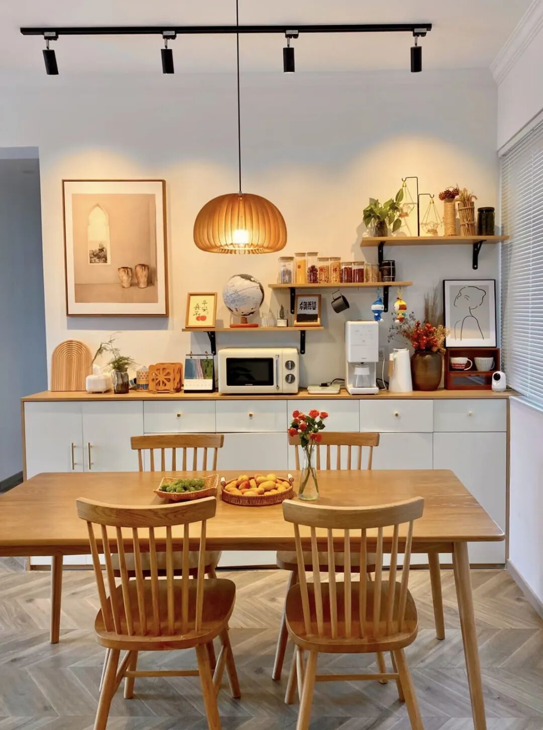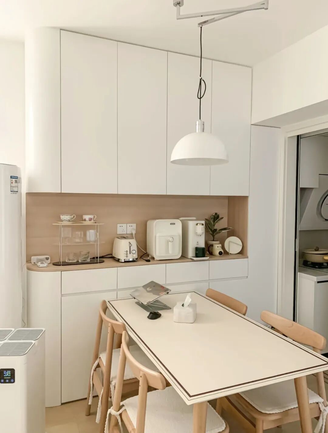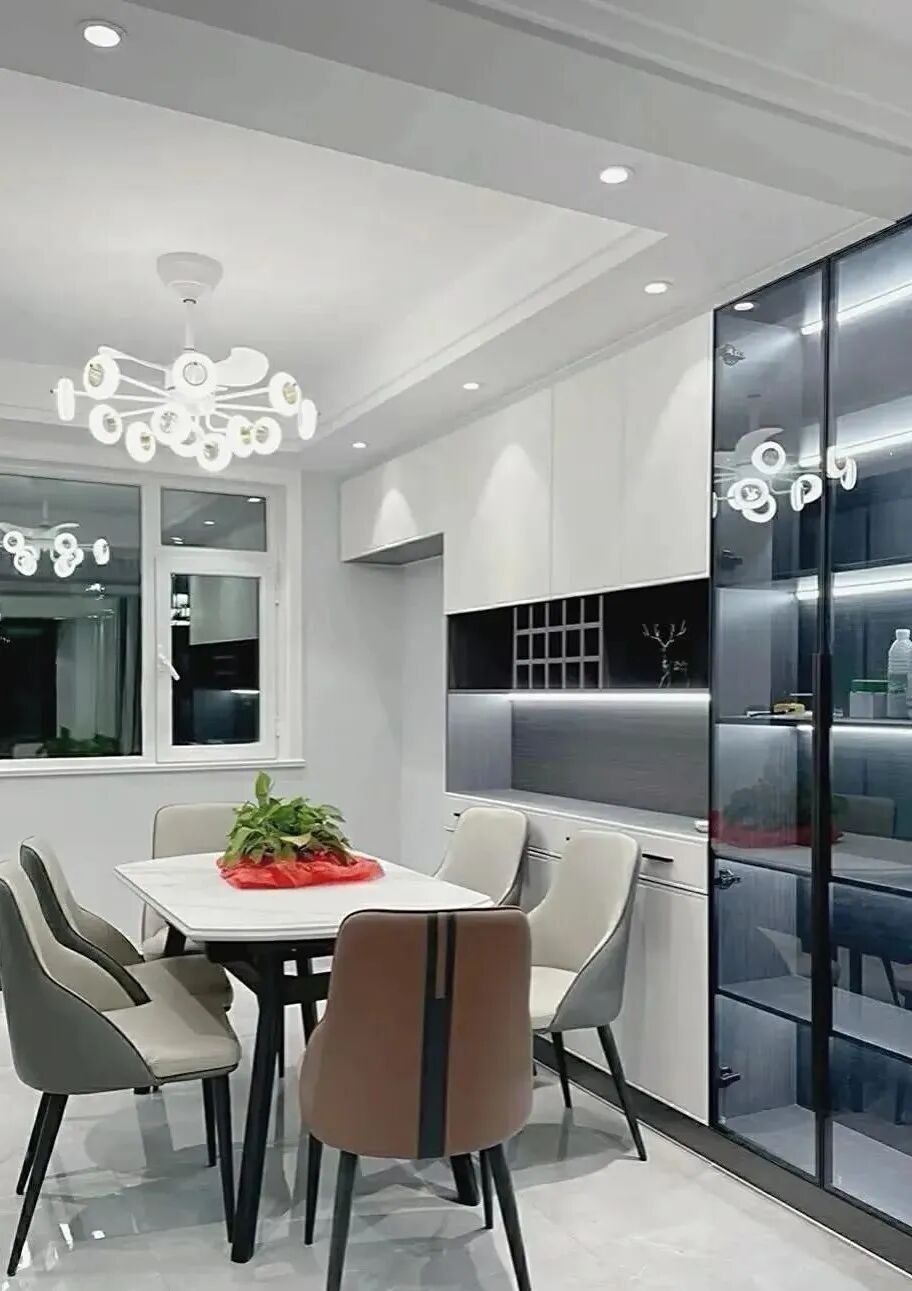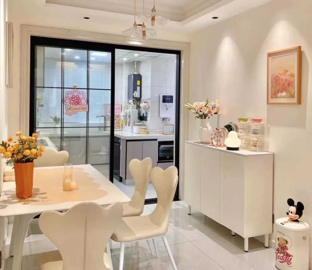 成品柜比较适合前期没有定制餐边柜,后期想要安装的的家庭。它的好处就是可变动性强,靠墙矮柜形式,视觉更灵活,空间会显得更宽敞通透,同时台面也能满足水吧台以及随手置物的功能。同时为了空间更加开阔,矮柜餐边柜,空间和光线都得到最大发挥。