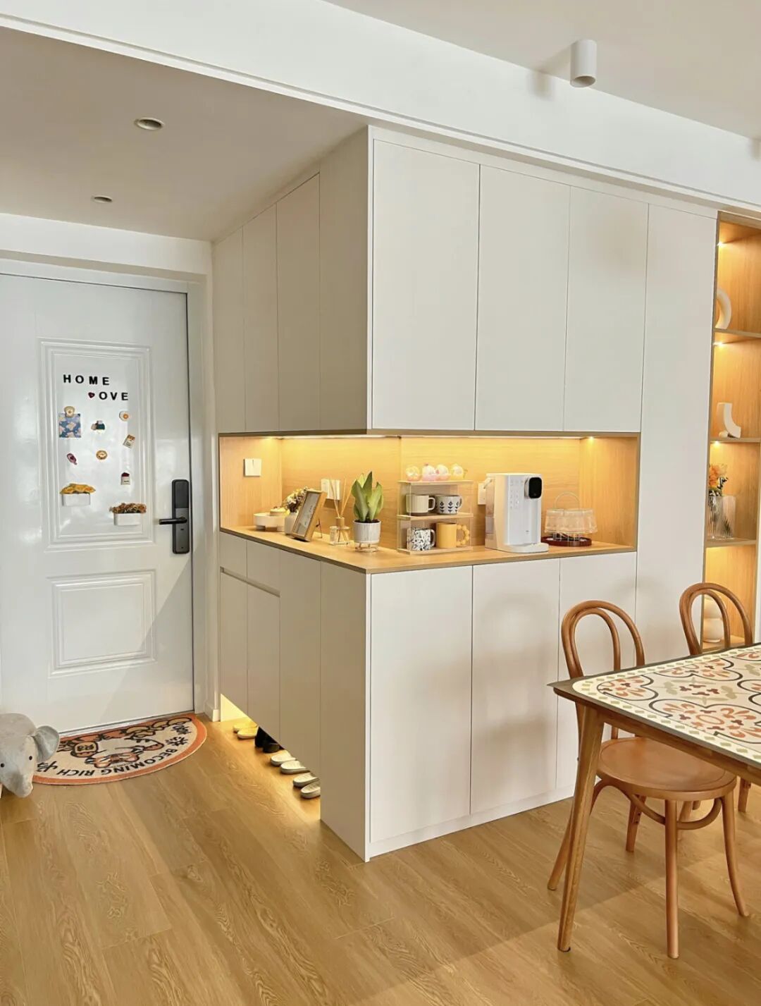 即使小空间,L型布局的餐边柜,也可以满足更多的收纳储物,完美实现小空间的超级收纳,餐边柜和鞋柜互相成就,满足各自的功能。