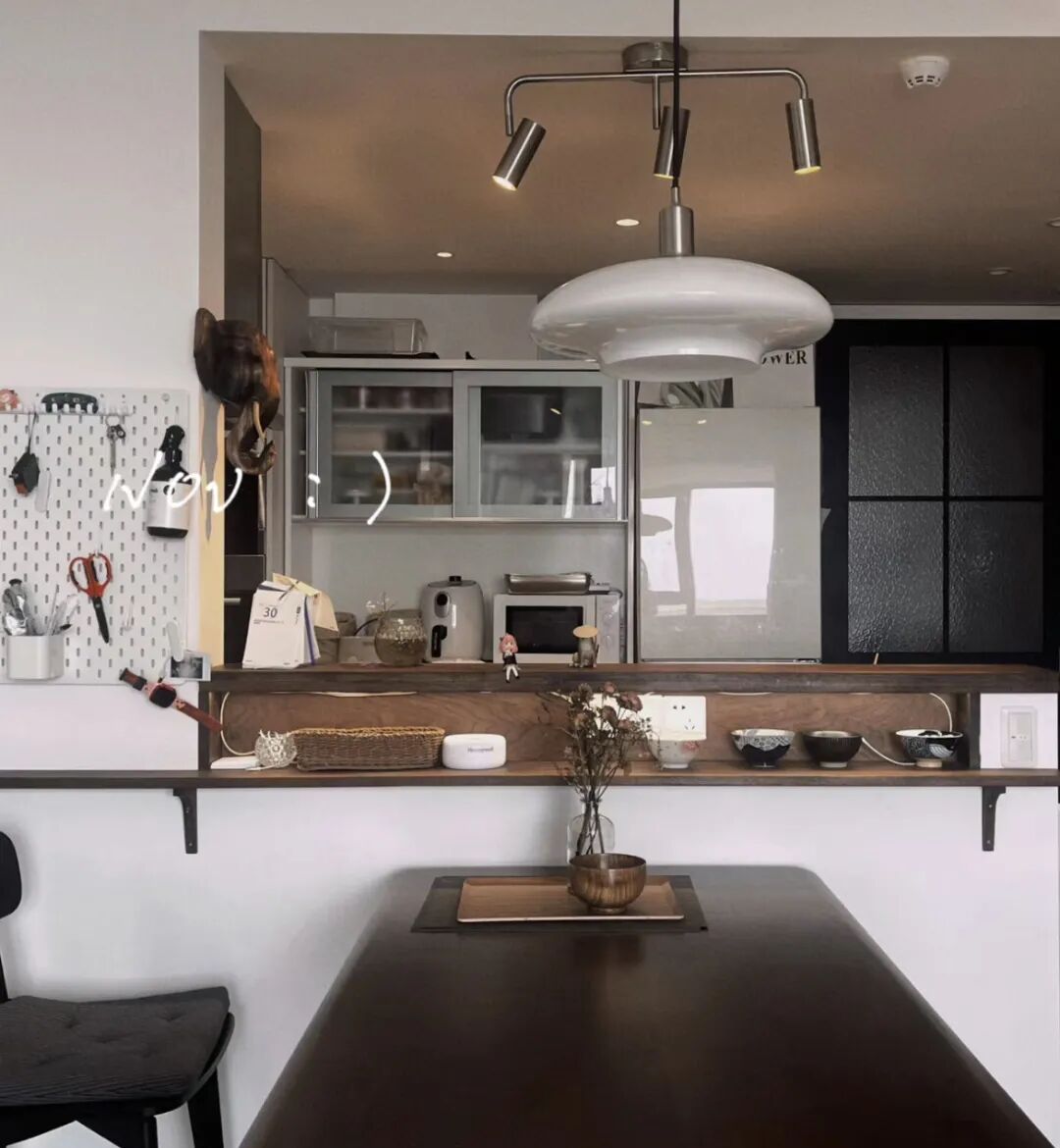 半墙餐边柜在一定程度上增加了储物空间,餐桌一侧的开放格可以随手置物,即使放一些东西也不用担心会落灰,旁边就是餐桌,随时可以伸手拿取。不管从客厅方向还是厨房方向都可以遮挡视线,进行空间的划分,保证隐私。