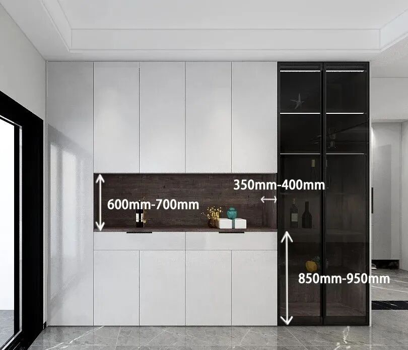 在不嵌入电器的情况下,餐边柜的深度不用太深,350mm-400mm即可;吊柜深度最好要比地柜少150mm,避免磕到头;台面高度则需要根据住户的身高来决定,一般都在850mm-950mm之间;中空高度最好要留够500-600mm,以免放不下咖啡机等小电器。