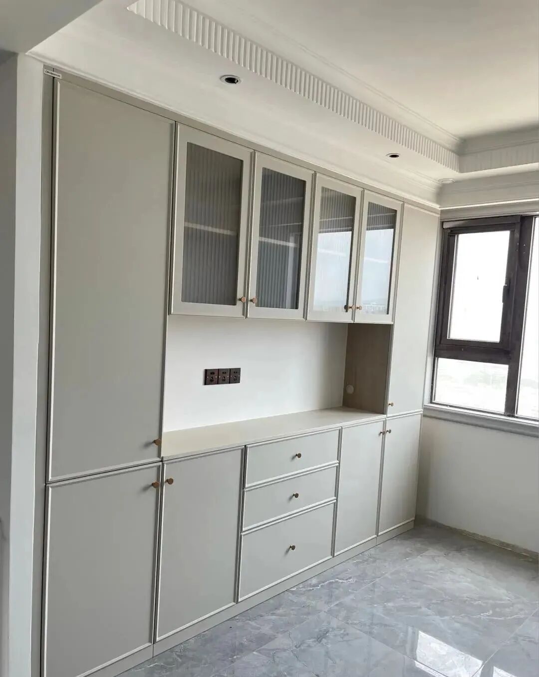 全封闭的餐边柜看起来很漂亮,但实用性却不高。所以说,不要做全封闭的餐边柜,要做半封闭的。