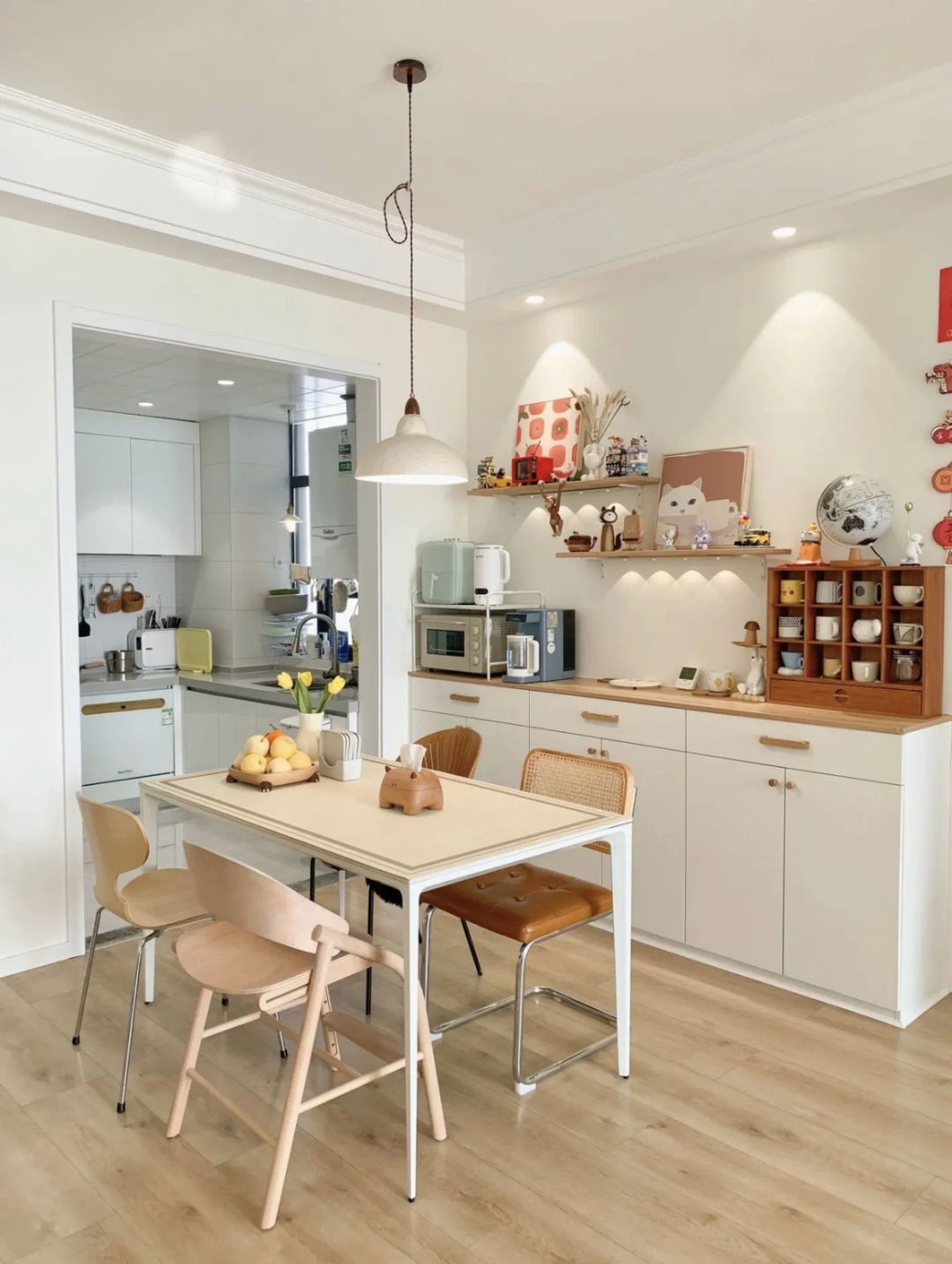 很多人装修时都会用餐边柜来分担厨房台面和餐桌的收纳压力,把餐边柜作为家里的储物和展示区。装修前参考了邻居家的一些设计,更好的利用了墙边空间,可以说是一个休闲实用的好地方。但也总有人说餐边柜很鸡肋,一些电器根本放不下,占地方还用不到。