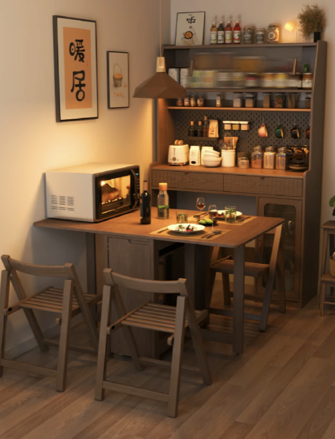如果家里空间比较小,还可以采用餐桌柜体组合的形式,用餐时将桌子支起来,平时就可以折叠收在柜子镂空部位,桌上的东西也可以收纳在柜子上,很方便,也很省地方。