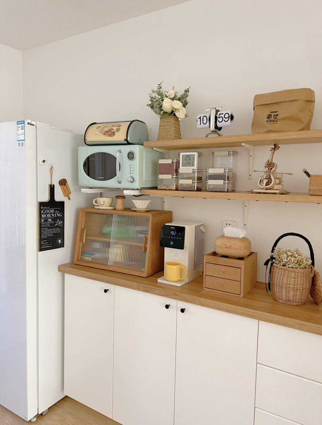 如果想要摆放一些微波炉或者咖啡机、面包机,建议提前预留好尺寸,避免隔板距离台面过低,导致放不进去。一般情况是在50公分左右即可,具体参考自家的小电器。