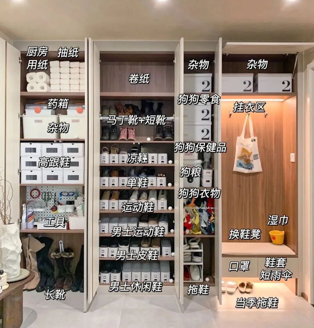 鞋区、挂区、换鞋凳都安排的井然有序,一定不要小看窄柜的功能。