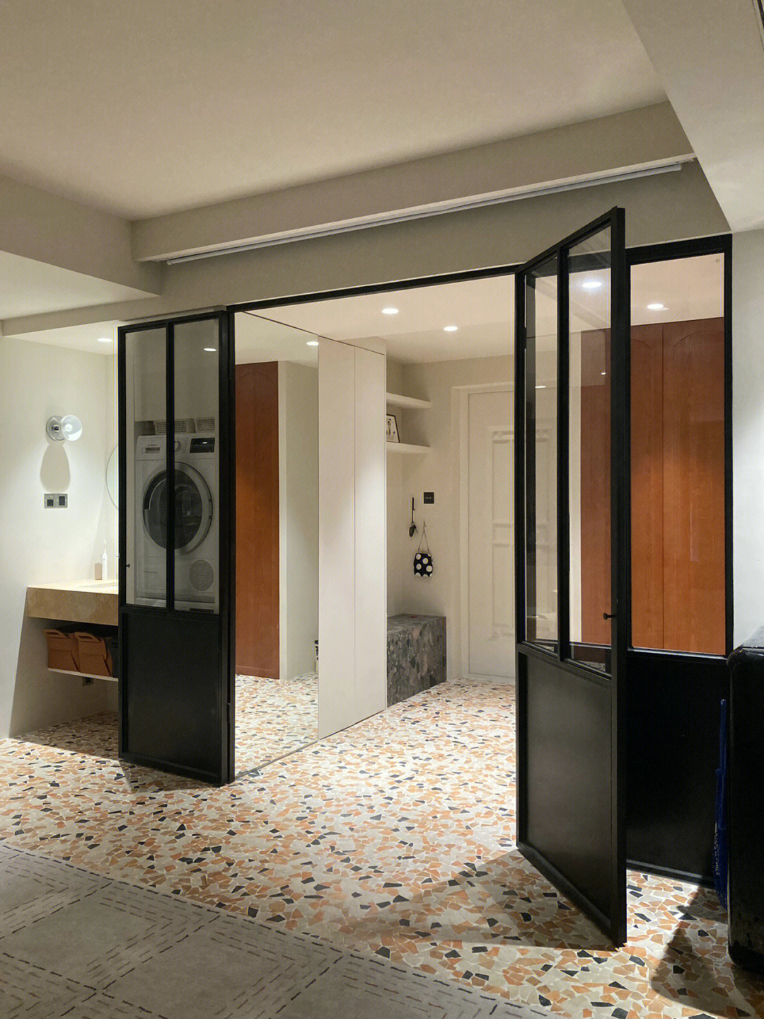 没有玄关,为了日常起居及隐私方便,也不影响空间的整体采光,玻璃+低柜组合还是较为可取(底部悬空设计,能放一排鞋,也好清理),唯一不足就是收纳性一般,建议上墙做收纳,比如门后、墙上装悬空拖鞋夹,能多收纳3-10双鞋。