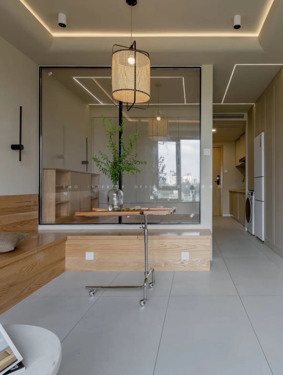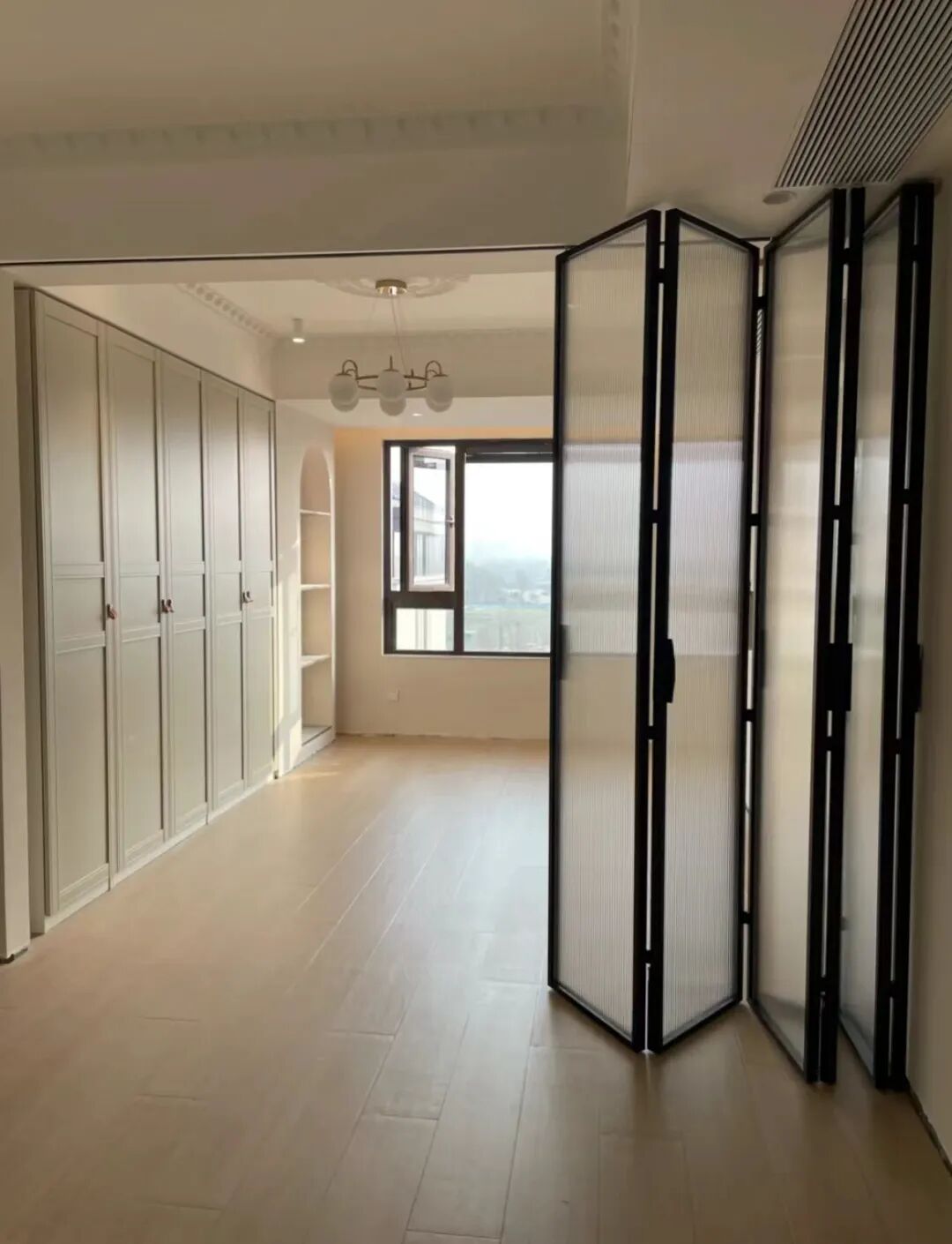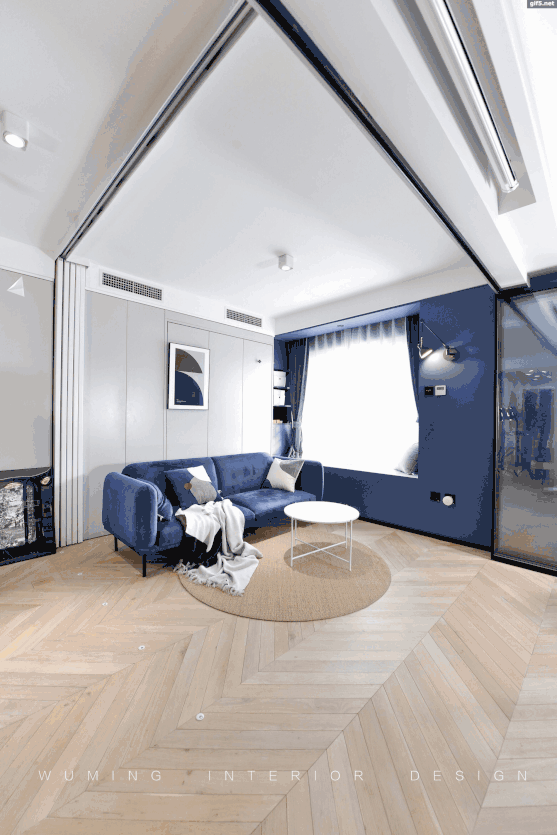 对于小户型来说,开放式厨房是显大利器,但因为其又有不隔绝油烟、无法开通天然气等痛点,因此让人又爱又恨。折叠透明的口袋门打造的玻璃房,平时打开,油烟大或验收天然气时关闭,灵活方便,还不占用空间。