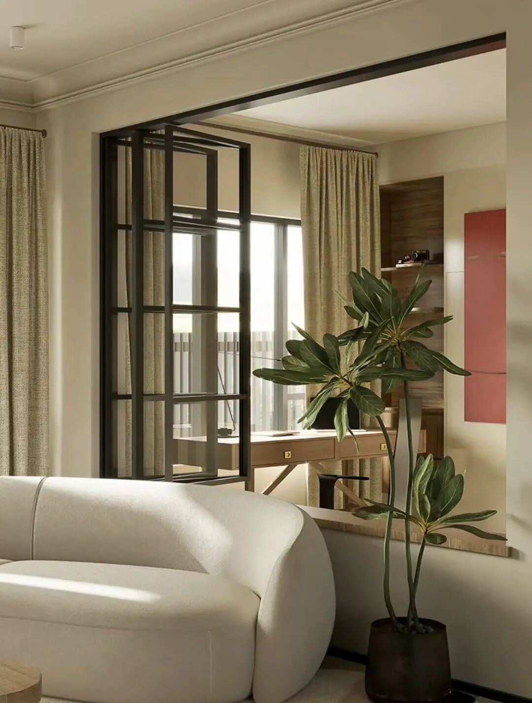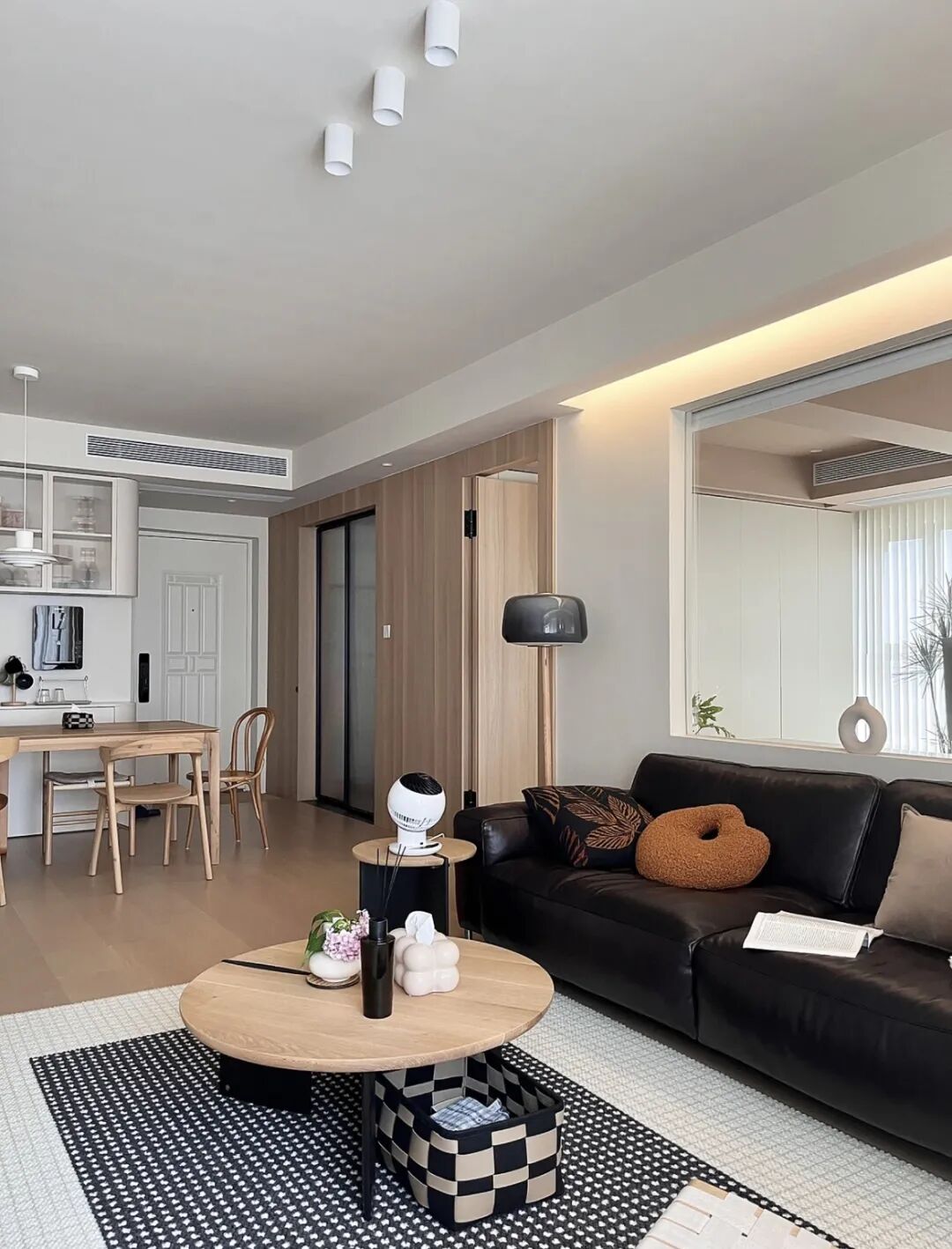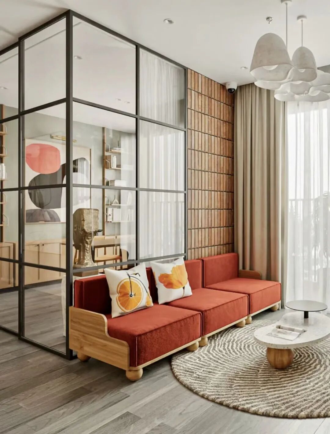 半墙的话也是一种不错的方式,留下一半的墙面,既可以将空间功能分区,又可以有所联系。如果怕隔音效果不好,还可以折中一下一半玻璃一半墙体,也就是大面积室内窗的形式,达到空间互通的效果。