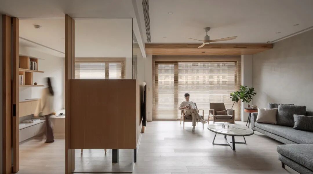 没有客人来的时候可以完全和客厅融为一体,作为餐厅的一部分进行使用。而当有客人来或者有空间需求的时候,拉起门就是一个独立的空间。