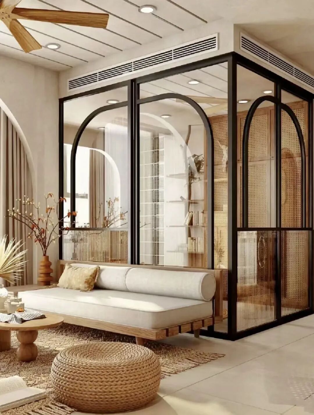 玻璃房的一大优势就是不像墙体一样装了就不能动了,而是具有可变性。可以与门做关联,折叠门关起时,可清晰划分空间功能,完全打开后,又让两个相邻空间变为一个整体,空间划分更加灵活,且有助于空间通透性的塑造。