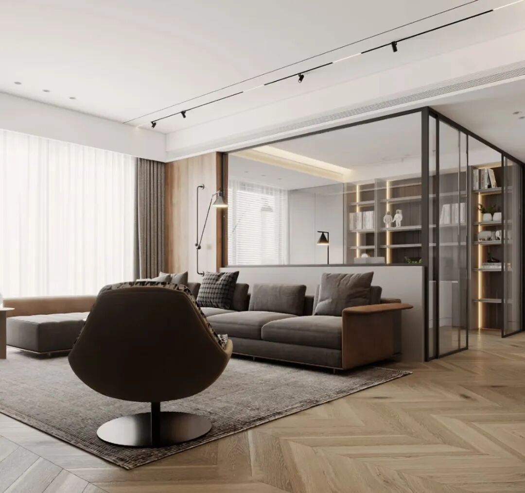 书房空间相对来说隐私需求不大,反而对采光要求更高一些,利用玻璃打造空间可以增强视觉纵深感,营造空间被放大的错觉,减少面积小带来的拥挤压抑感,以此来改善户型缺陷。