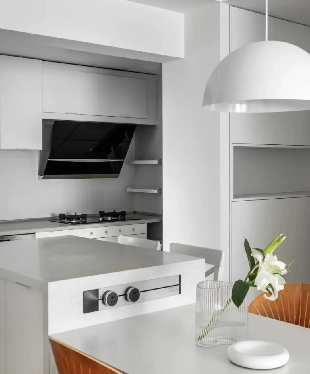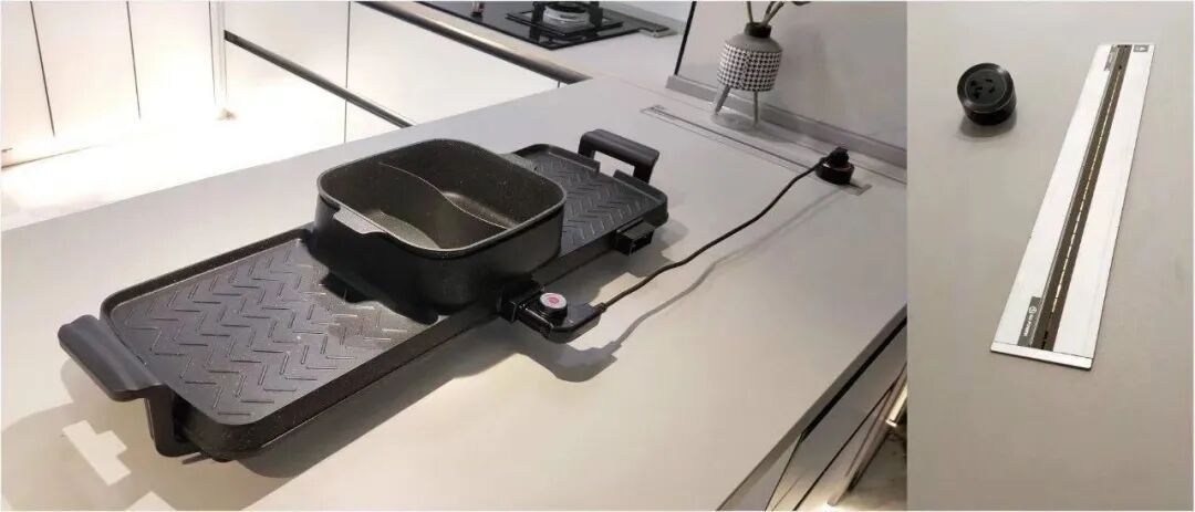 岛台做了嵌入式轨道插座,能够隐藏线路美观大方,适合不靠墙的地方,记得要在下方预留好三孔插座;平时在岛台上吃火锅、烤肉真的不用在隔着老远拉插线板了。