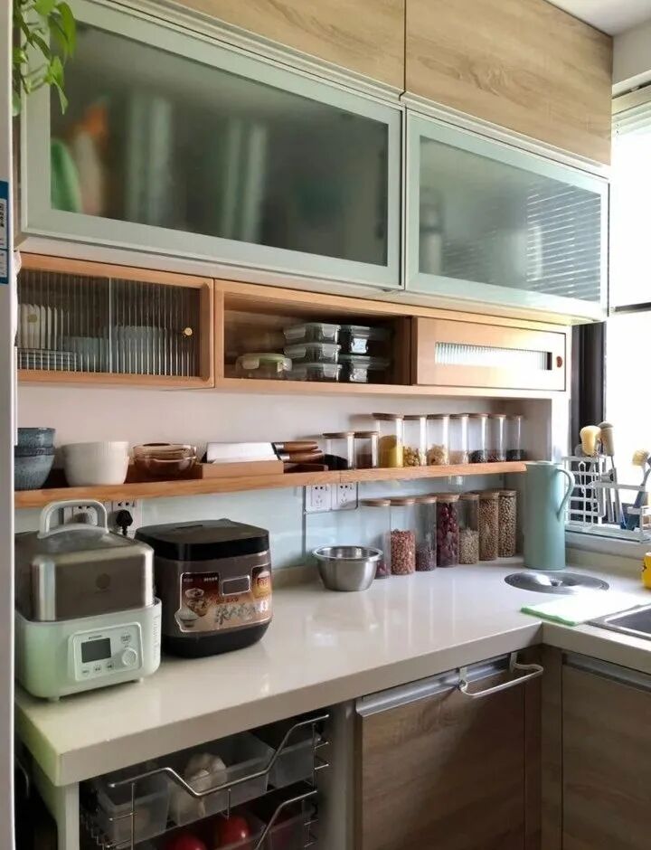 但是这种设计不适合放常用的调料餐具,用着不方便,放台面上又占地儿,不如考虑在吊柜下方增加一个下吊柜,解放台面还不用额外购买收纳架,视觉上也更有层次。