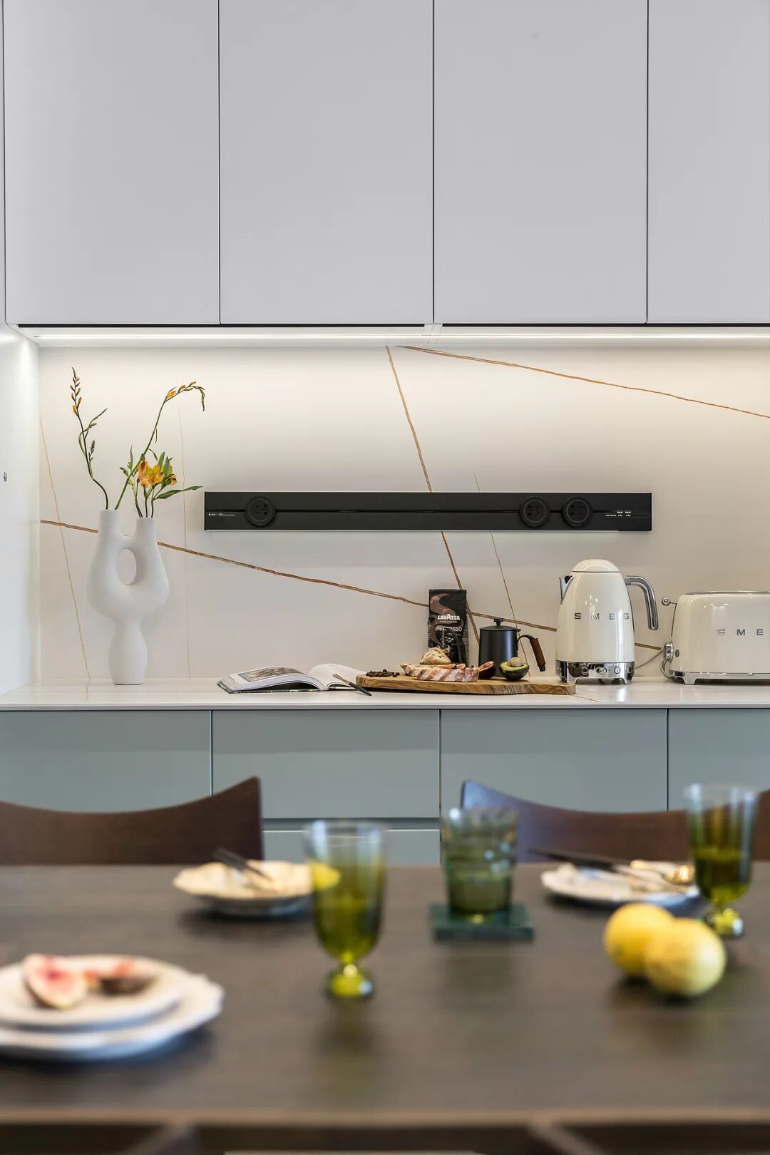 我家厨房小电器多,怕插座不够用、经常插拔不安全的问题,果断将轨道插座安装在了餐边柜旁和岛台附近,没有安装在厨房(明装不美观,油烟聚集时间久了易脏),使用时无需移动电器,爸妈来了都夸我很会布置。